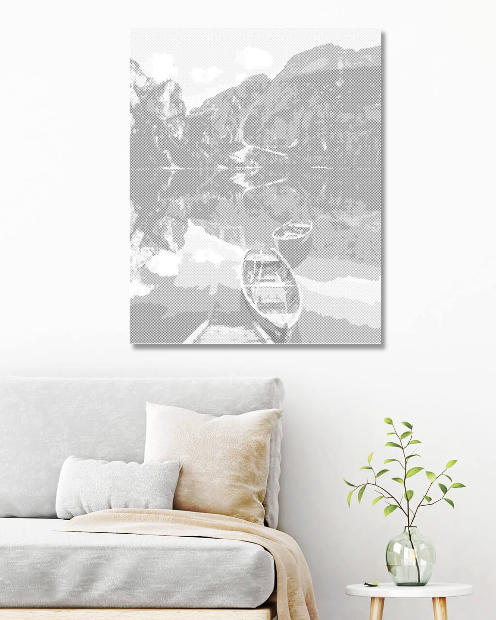Bodkovanie - DVE DREVENÉ LOĎKY NA JAZERE