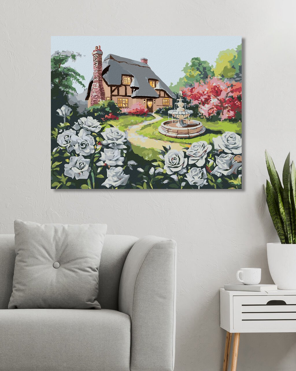 Diamantové maľovanie - BIELE RUŽE A DOM S FONTÁNOU (D. RUSTY RUST)