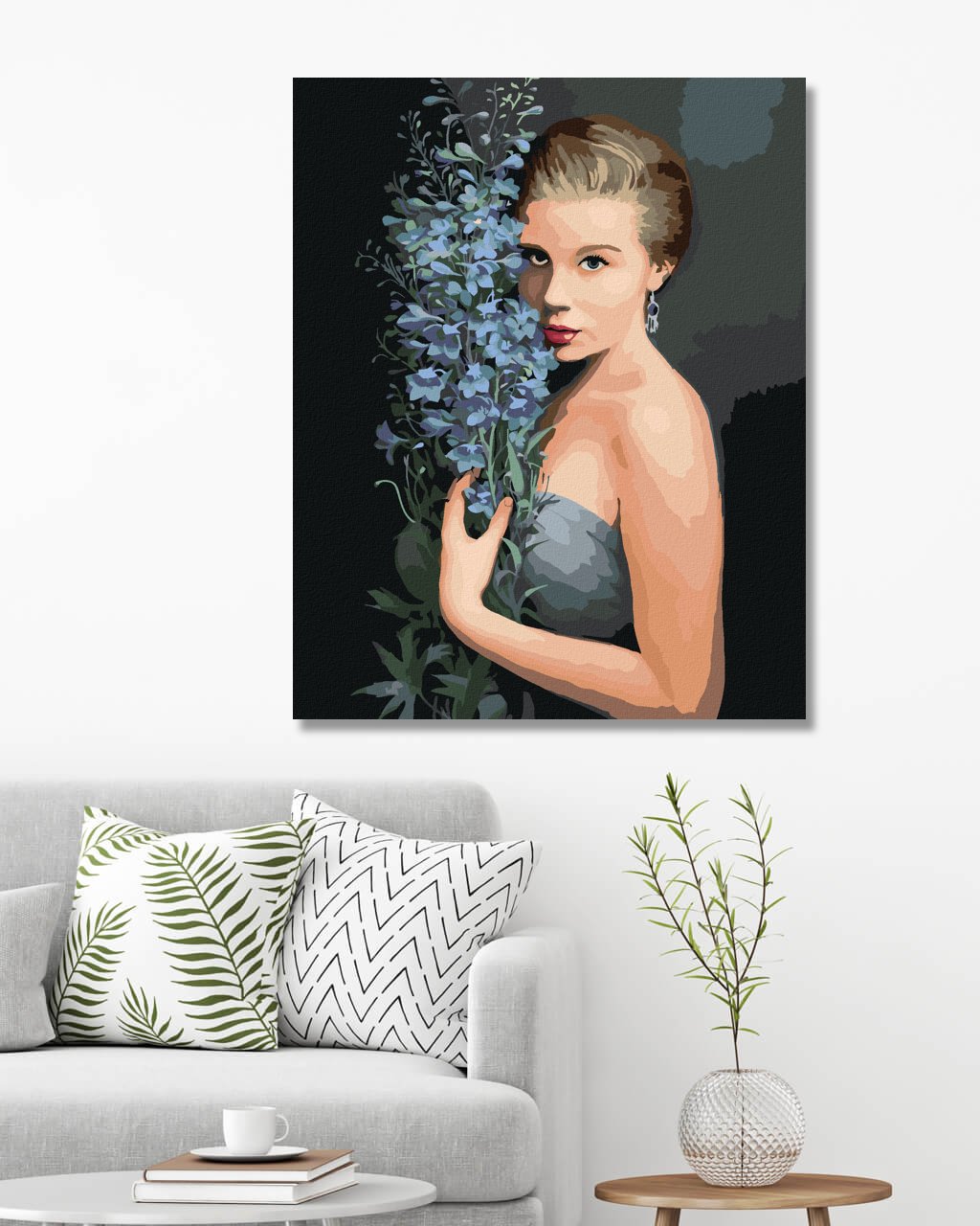 Diamantové maľovanie - BLONĎATÁ ŽENA A MODRÉ KVETY (PIETER WAGEMANS)