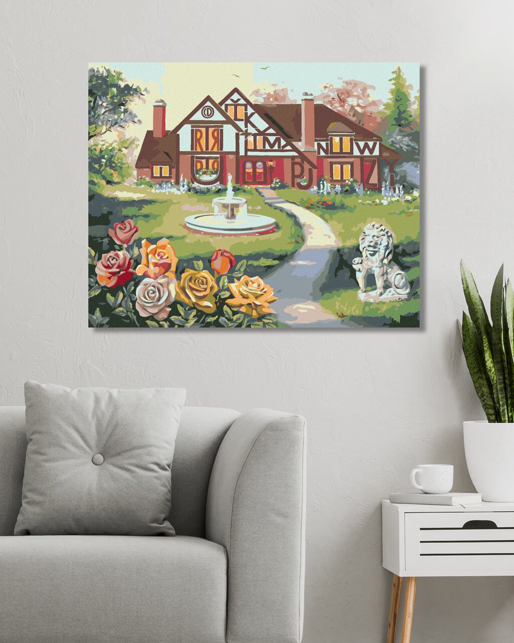 Diamantové maľovanie - DOM S PÍSMENAMI A FONTÁNOU, RUŽA A SOCHA LEVA (D. RUSTY RUST)