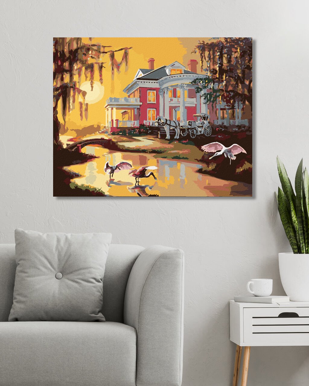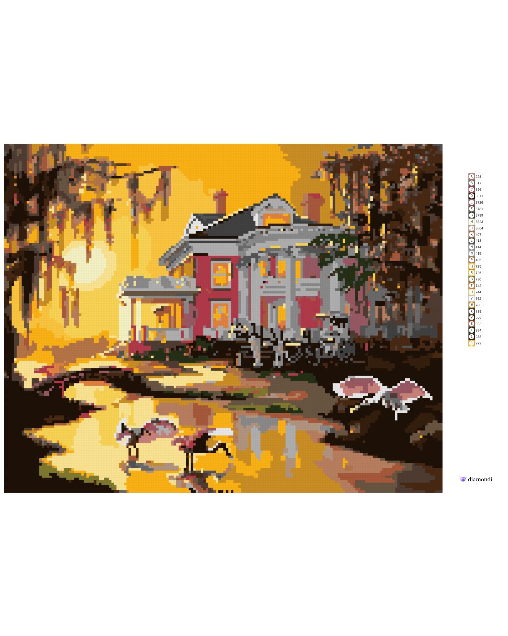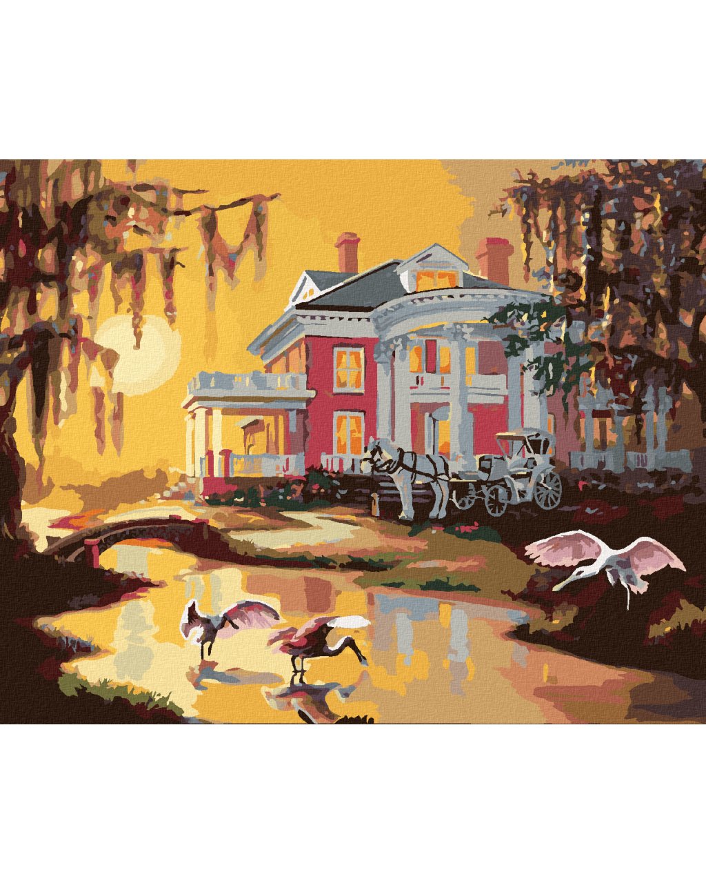 Diamantové maľovanie - KOČIAR S BIELYM KOŇOM PRI DOME, VTÁKY A ZÁPAD SLNKA (D. RUSTY RUST)