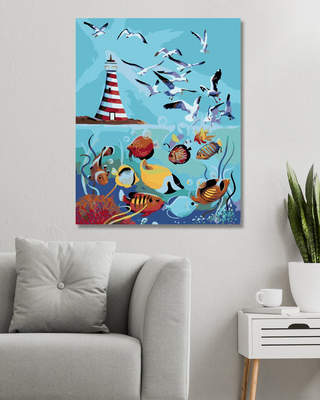 Diamantové maľovanie - MAJÁK, ČAJKY A RYBY (D. RUSTY RUST)