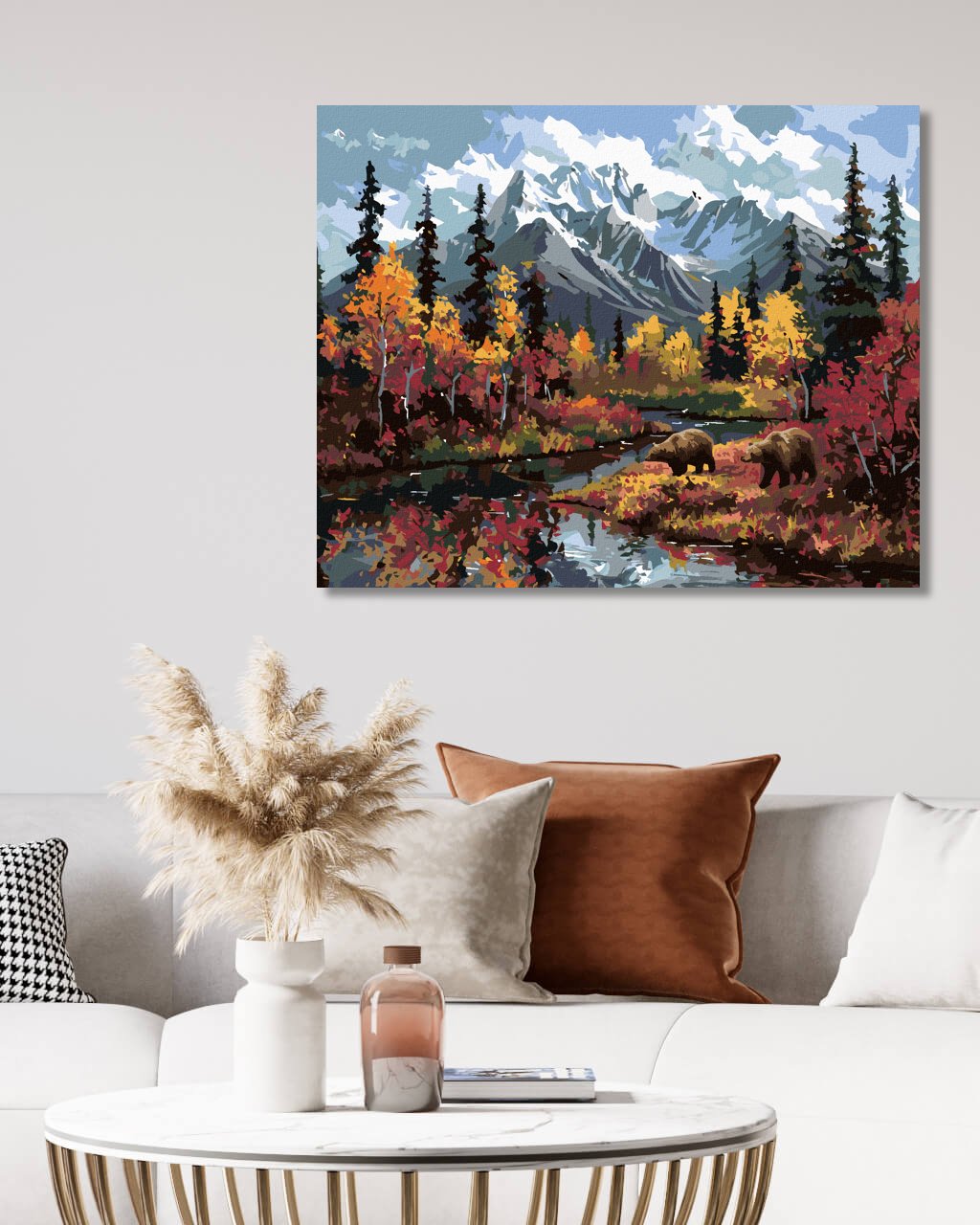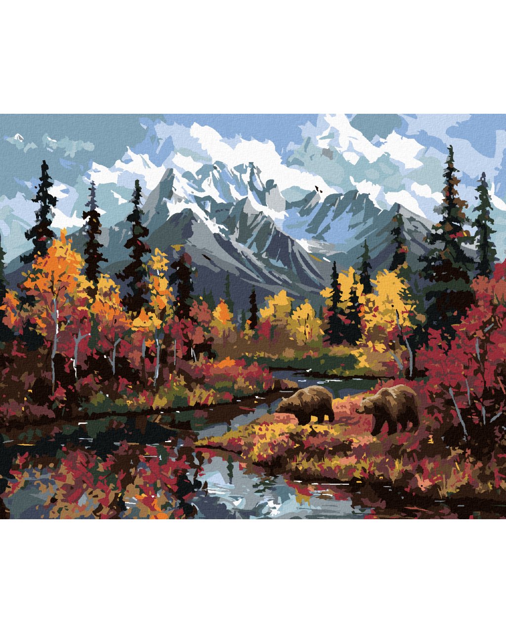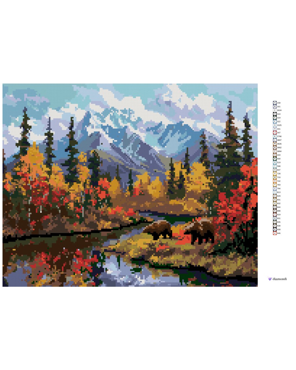 Diamantové maľovanie - MEDVEĎ PRI RIKE, HORY A JESENNÉ STROMY