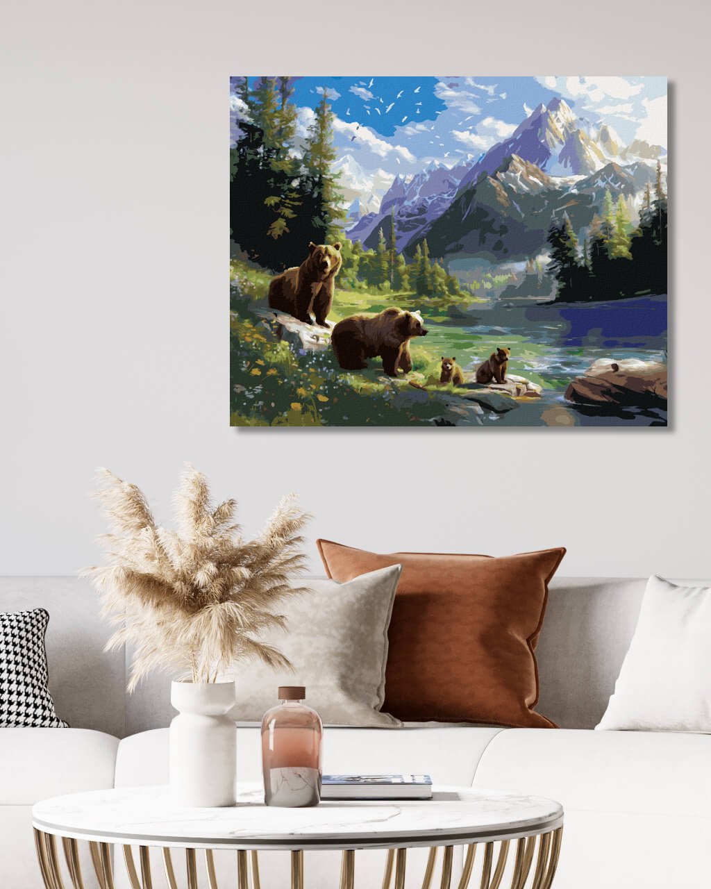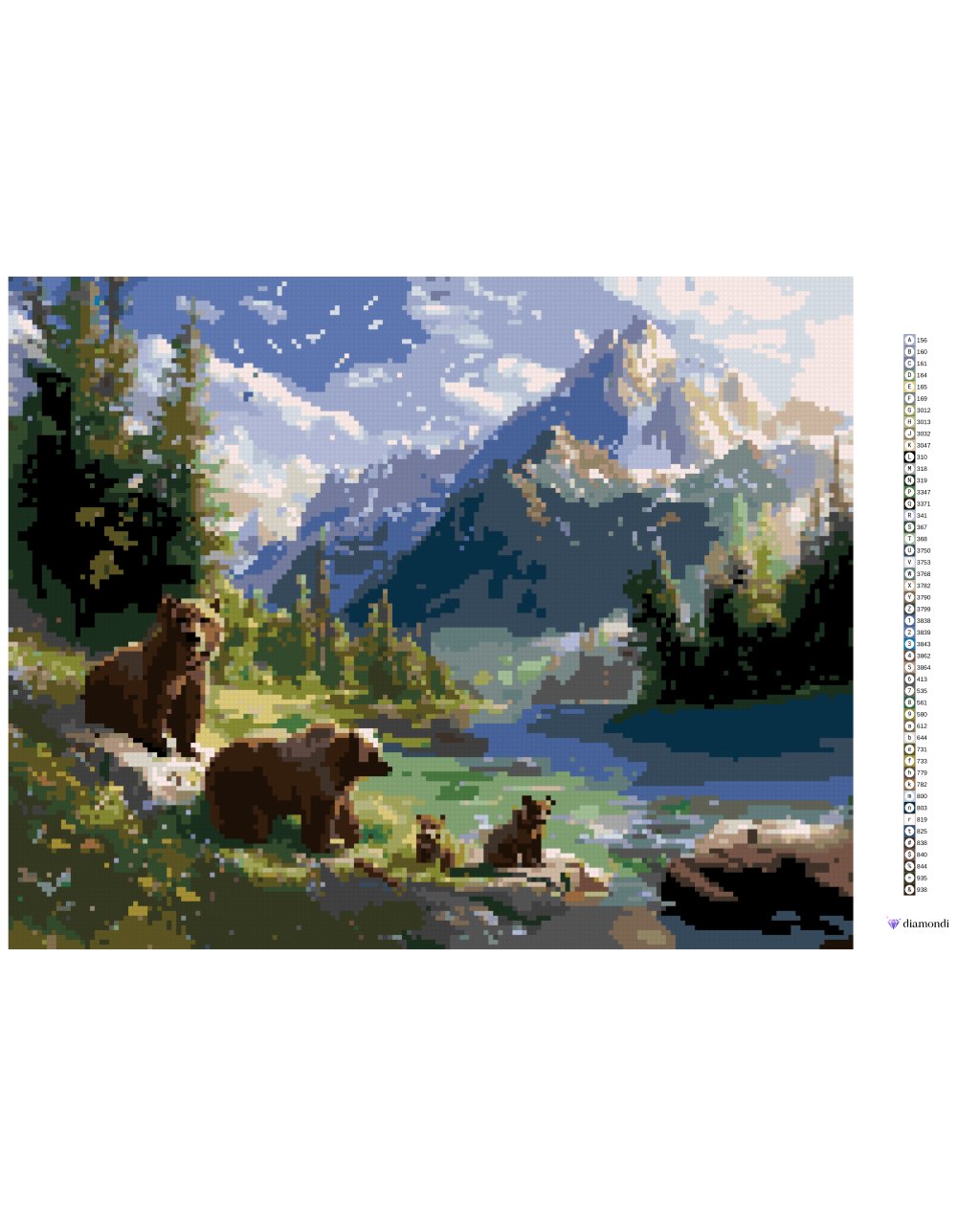 Diamantové maľovanie - MEDVEĎ S MLÁĎATAMI, JAZERO A HORY
