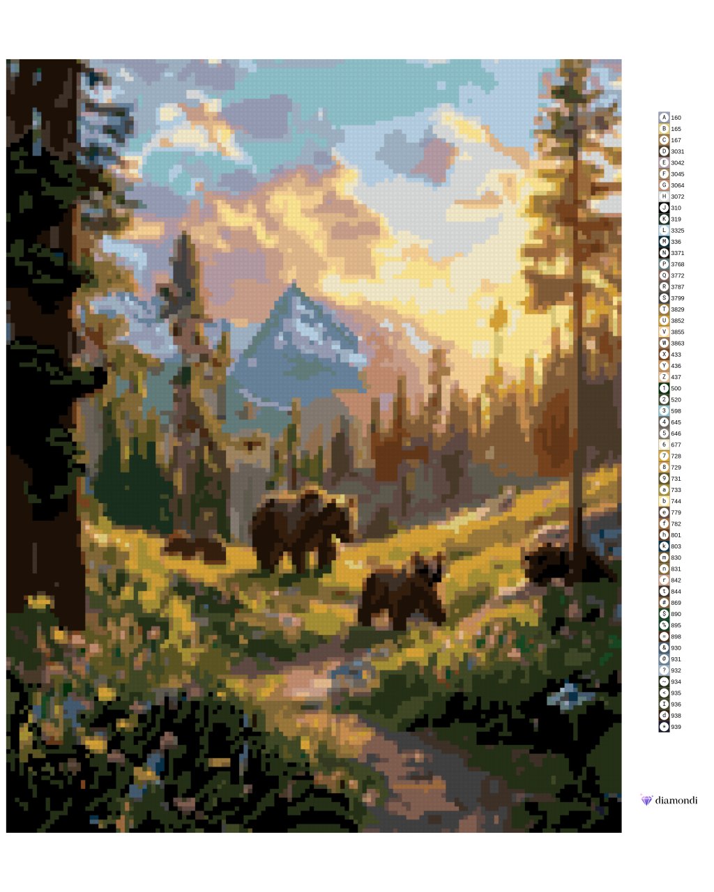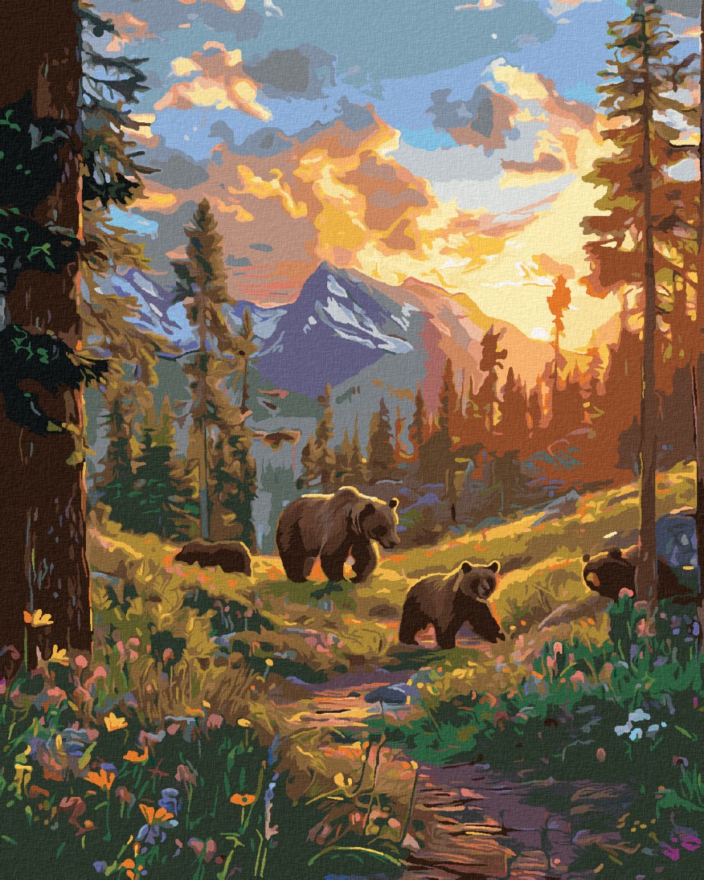 Diamantové maľovanie - MEDVEĎ S MLÁĎATAMI NA PRECHÁDZKE A ZÁPAD SLNKA
