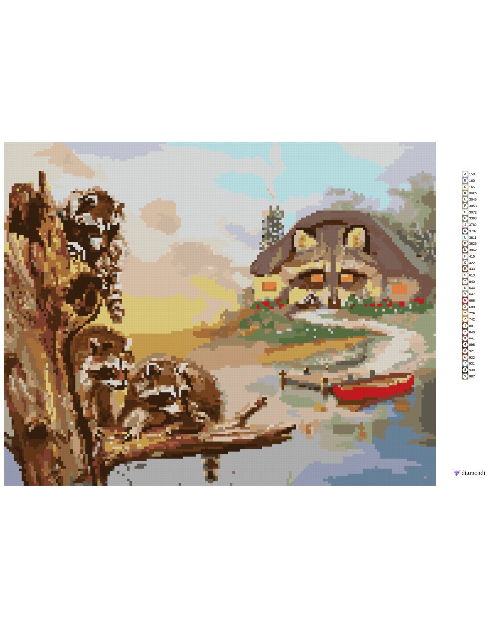 Diamantové maľovanie - MÝVAL NA BRVNE, MÓLO S LOĎKOU A CHATA (D. RUSTY RUST)