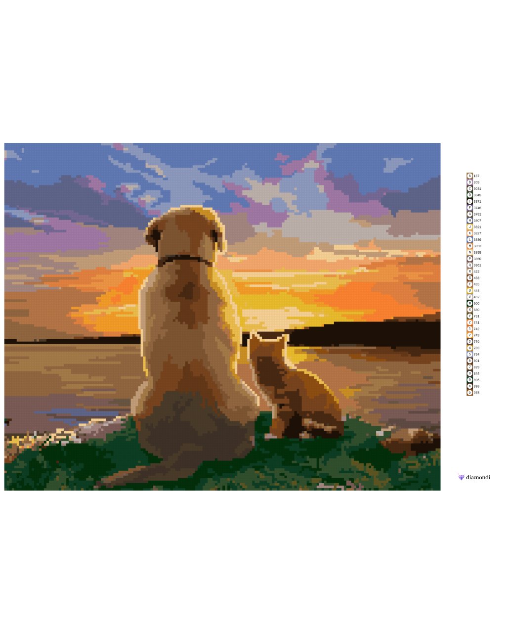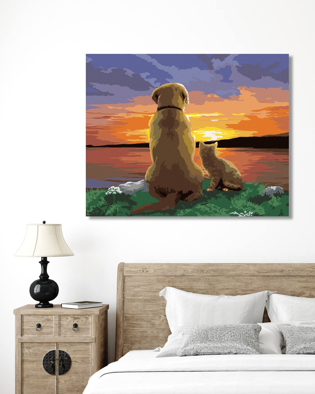 Diamantové maľovanie - PES A MAČKA POZORUJÚCI ZÁPAD SLNKA (HOWARD ROBINSON)