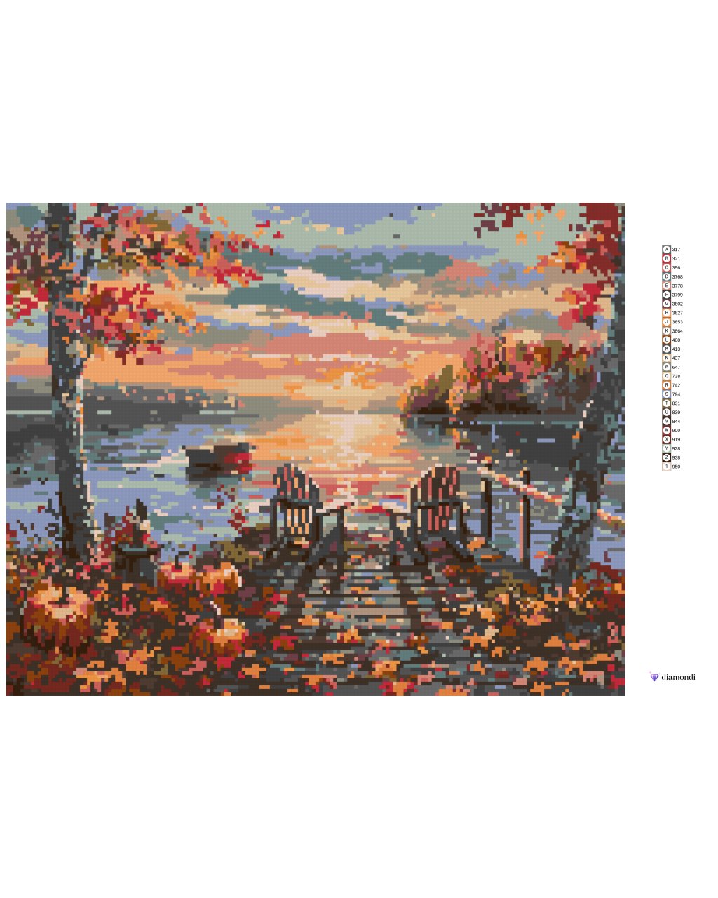 Diamantové maľovanie - POSEDENIE NA MÓLE, ČLN, JESENNÉ STROMY A ZÁPAD SLNKA