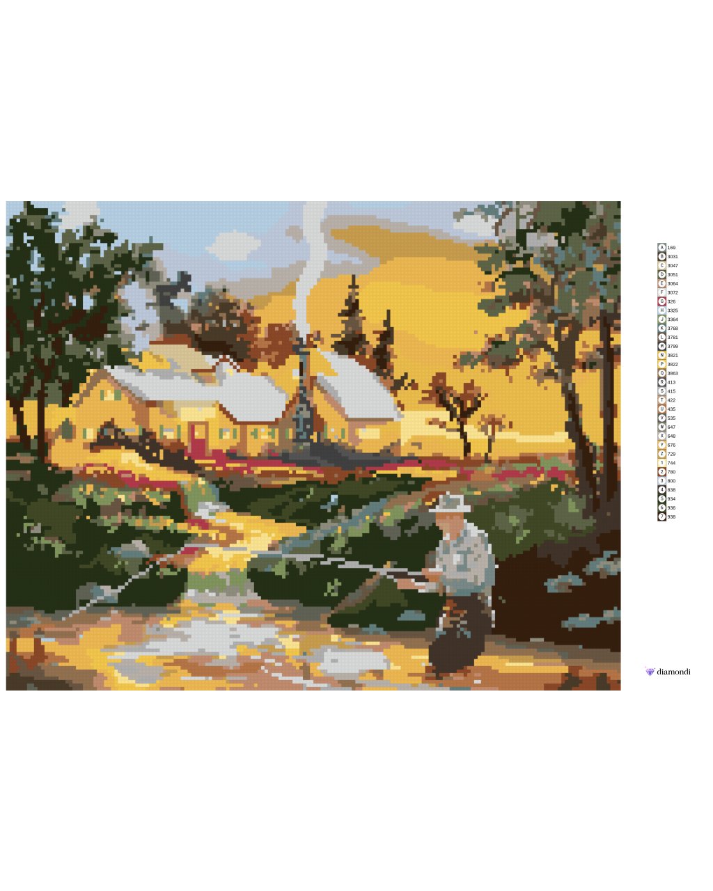 Diamantové maľovanie - RYBÁR V RIEKE, DOM A ZÁPAD SLNKA (D. RUSTY RUST)