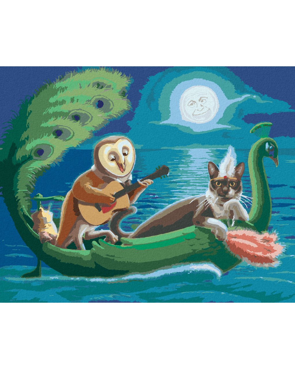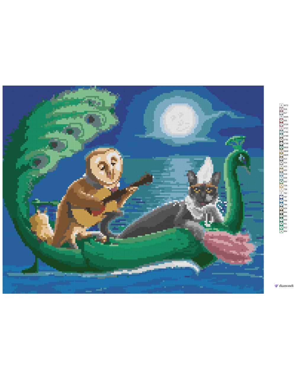 Diamantové maľovanie - SOVA A MAČKA NA LODI V TVARE PÁVA (SUE ELLEN BROWN)