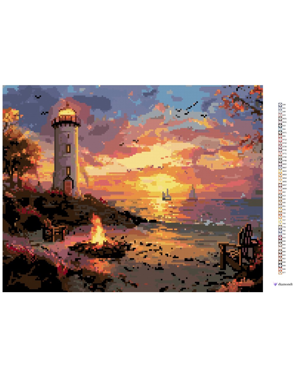 Diamantové maľovanie - TÁBORÁK NA PLÁŽI, MAJÁK A ZÁPAD SLNKA