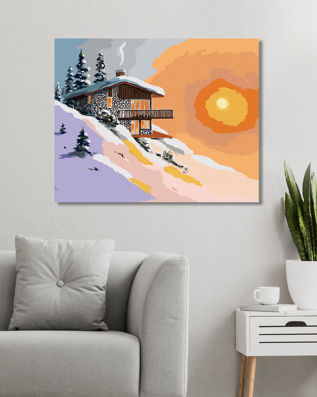 Diamantové maľovanie - ZASNEŽENÁ CHATA PRI ZÁPADE SLNKA (D. RUSTY RUST)