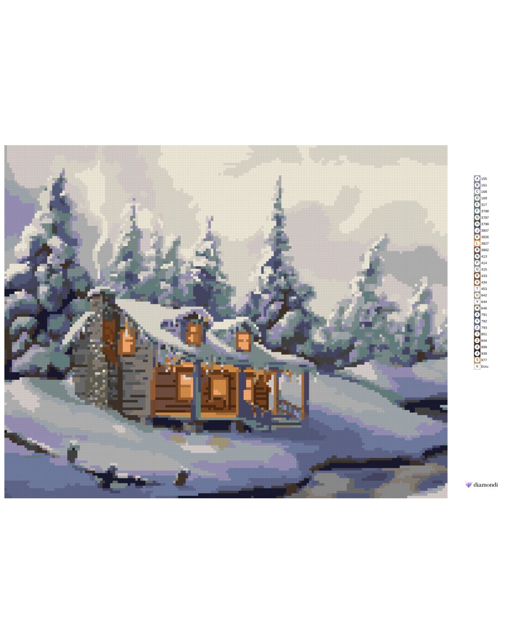 Diamantové maľovanie - ZASNEŽENÉ STROMY, RIEKA A CHATA V ZIME (D. RUSTY RUST)