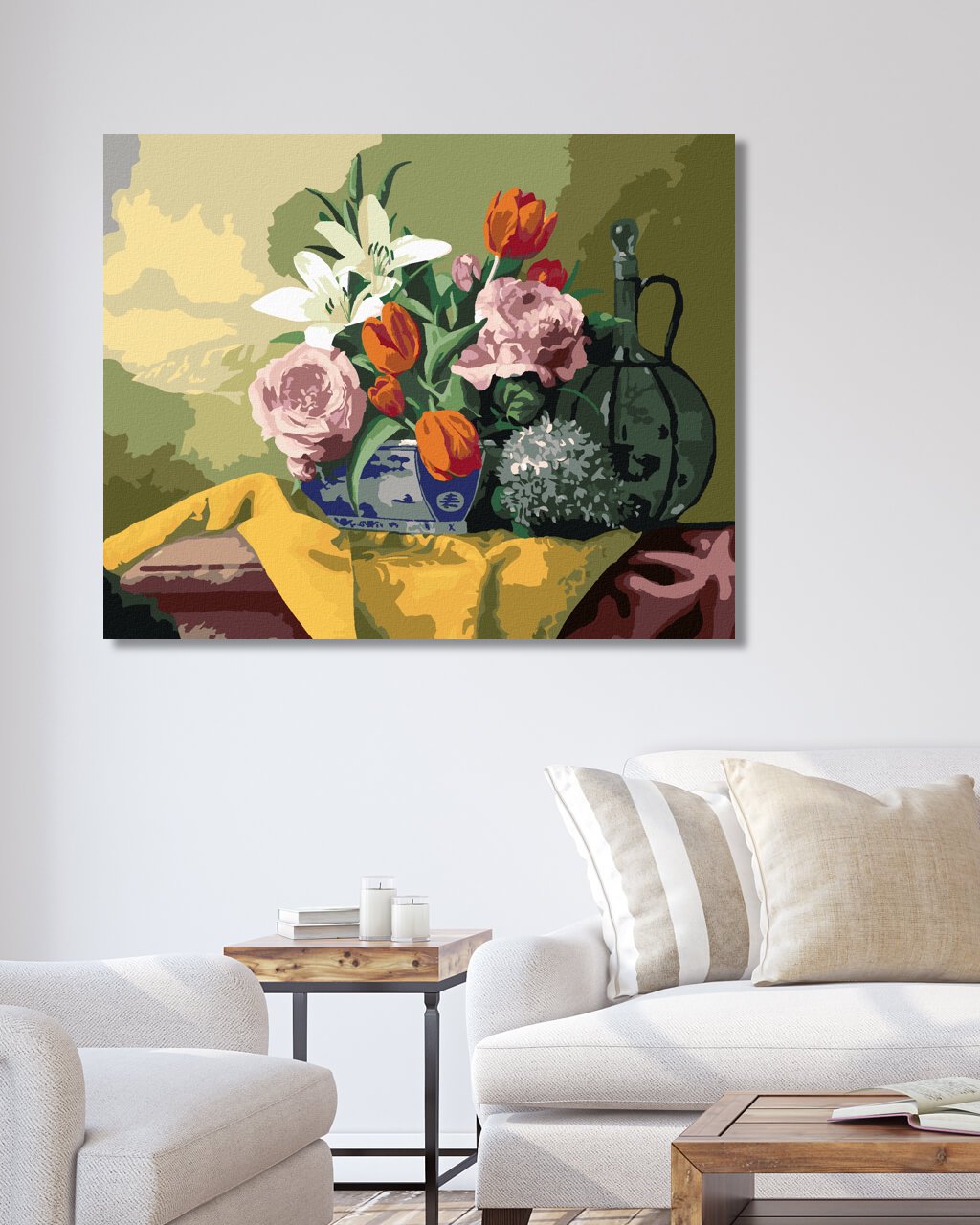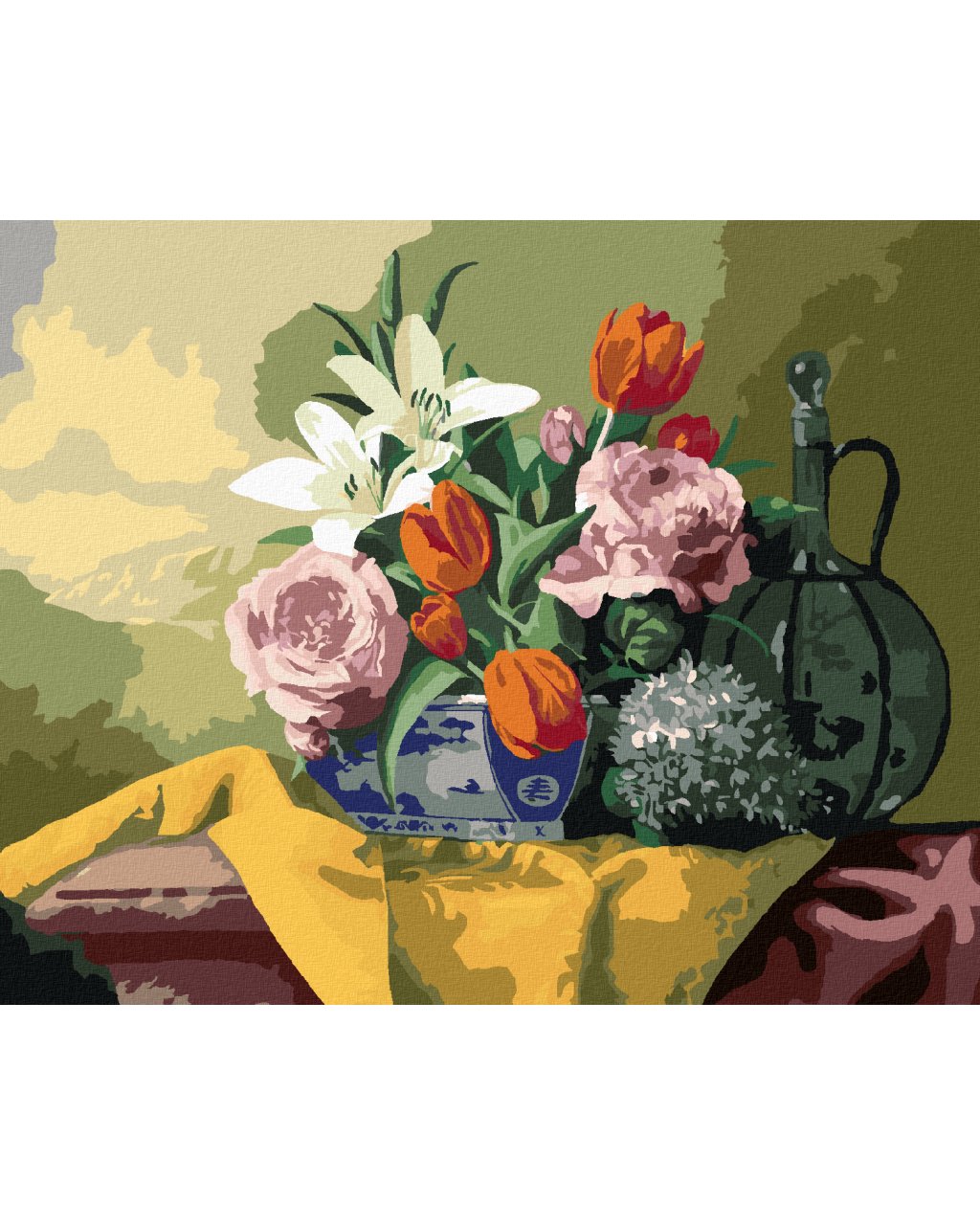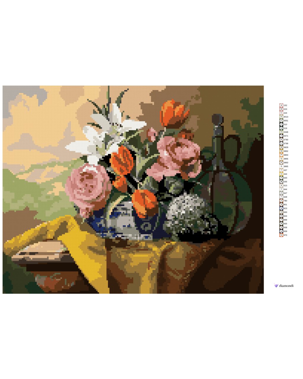 Diamantové maľovanie - ZÁTIŠIE TULIPÁNY, ĽALIE, HORTENZIE A RUŽE NA ŽLTOM OBRUSE (PIETER WAGEMANS)