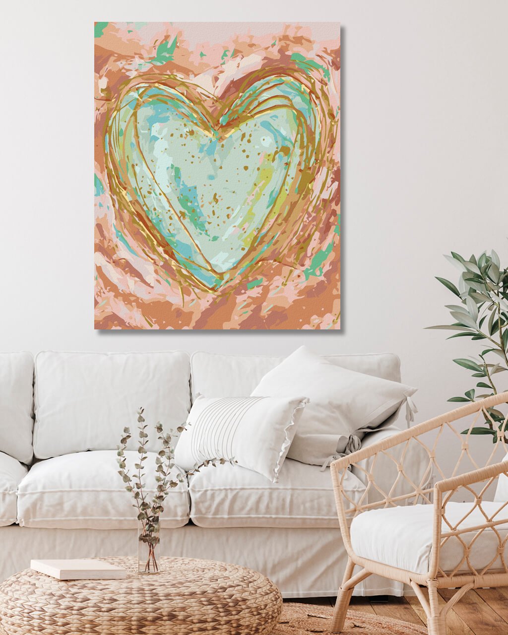 Diamantové maľovanie - ZELENÉ SRDCE NA RUŽOVOM POZADÍ (HALEY BUSH)
