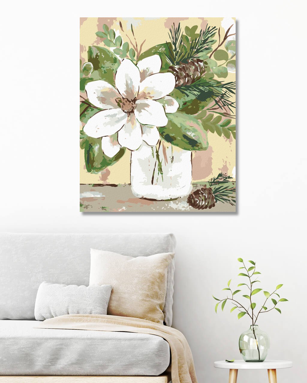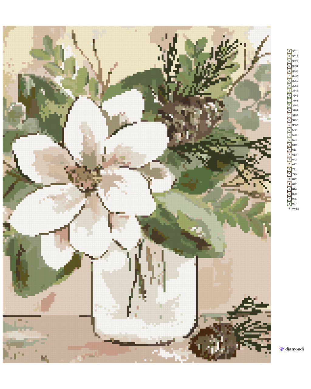 Diamantové maľovanie - ZIMNÉ MAGNÓLIE V POHÁRI (HALEY BUSH)