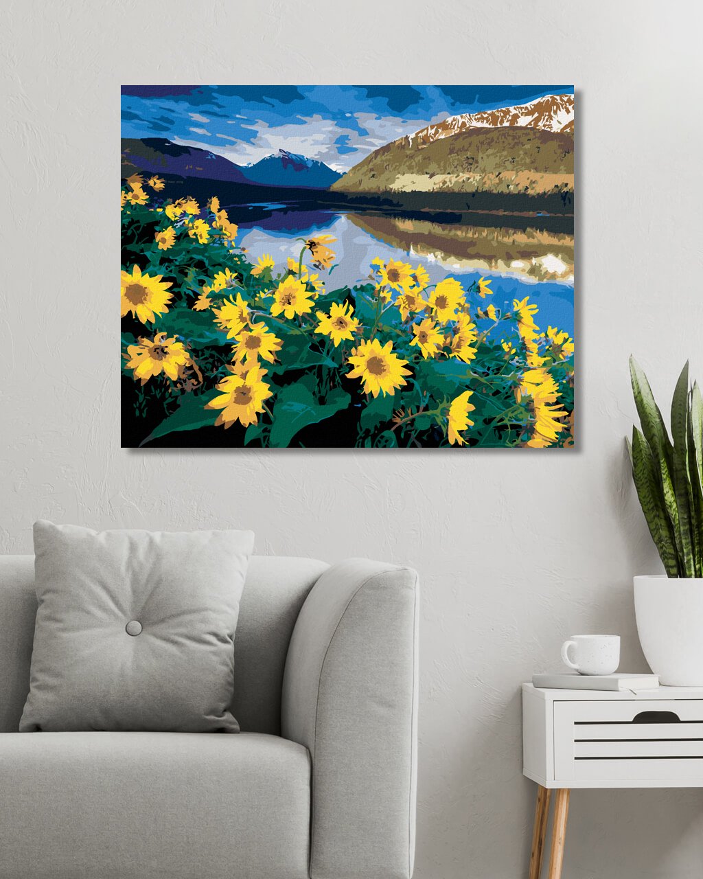 Diamantové maľovanie - ŽLTÉ KVETY PRI HORSKOM JAZERE (DENNIS FRATES)