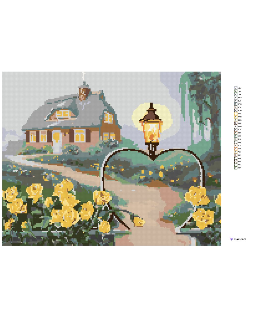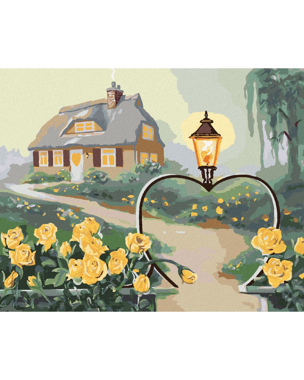 Diamantové maľovanie - ŽLTÉ RUŽE, BRÁNKA V TVARE SRDCA S LAMPOU A DOM (D. RUSTY RUST)