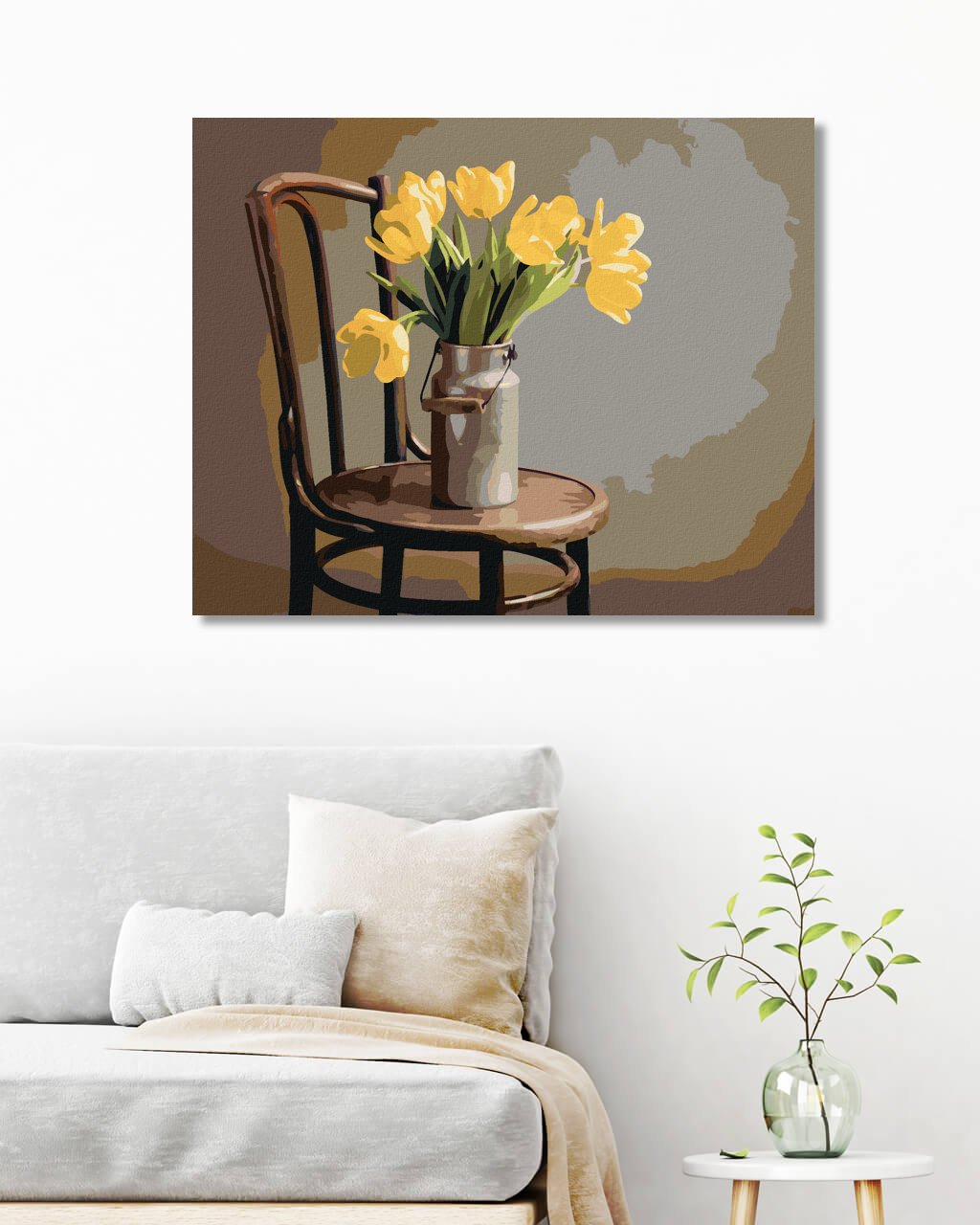 Diamantové maľovanie - ŽLTÉ TULIPÁNY V KONVICI NA MLIEKO NA STOLIČKE