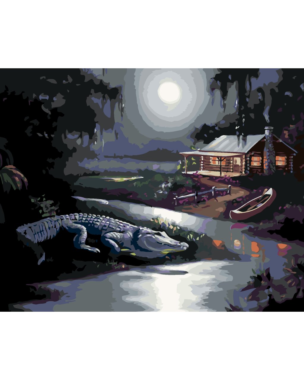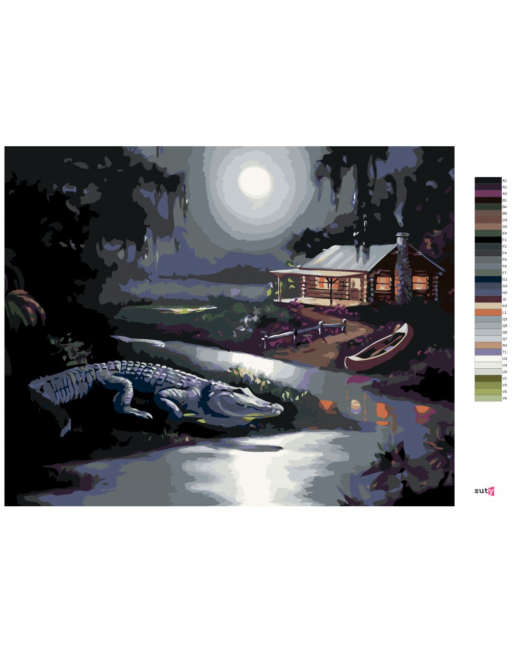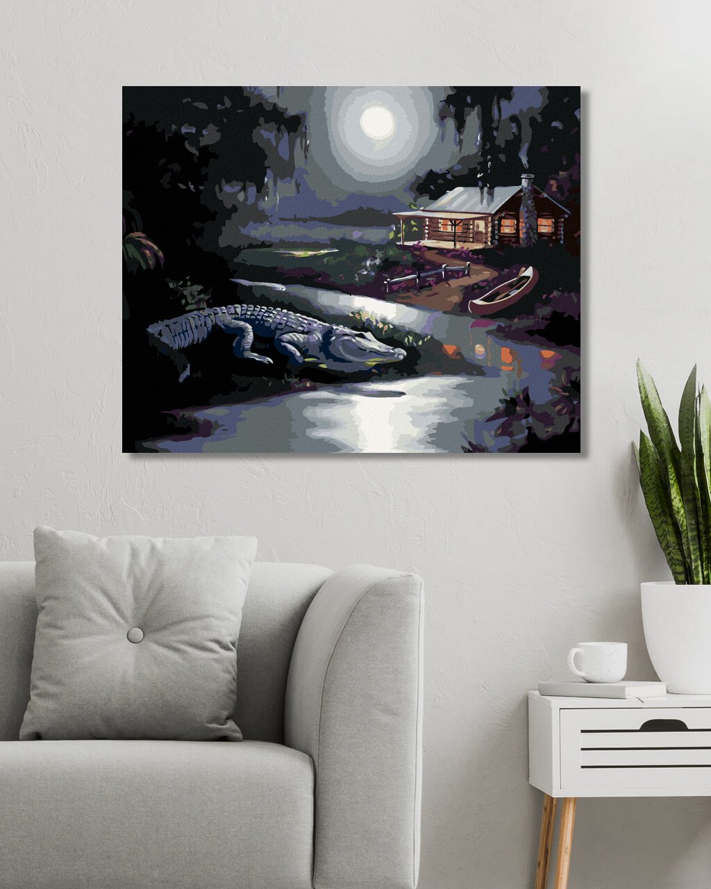 Maľovanie podľa čísel - ALIGÁTOR NA BREHU A CHATA PRI SPLNE (D. RUSTY RUST)