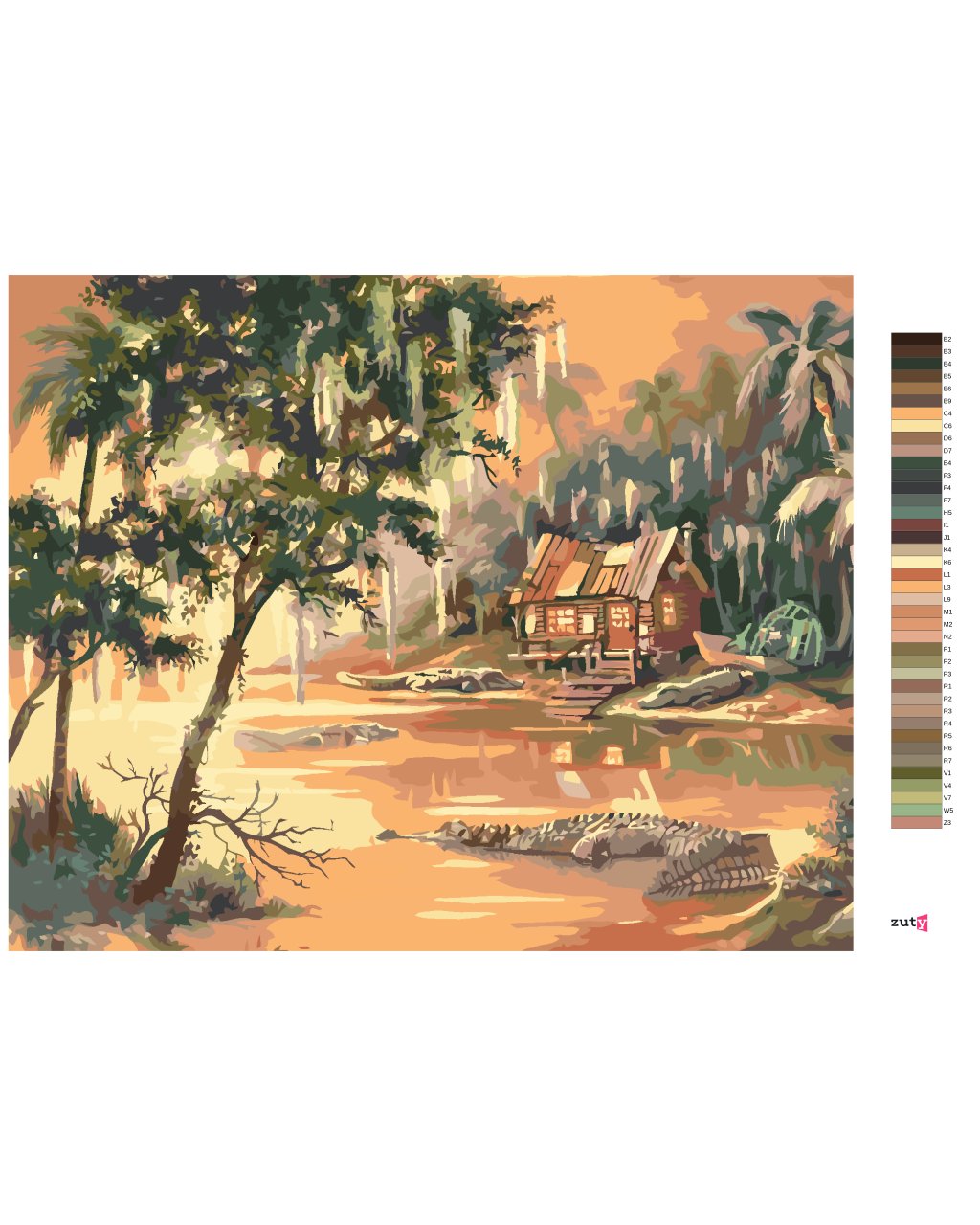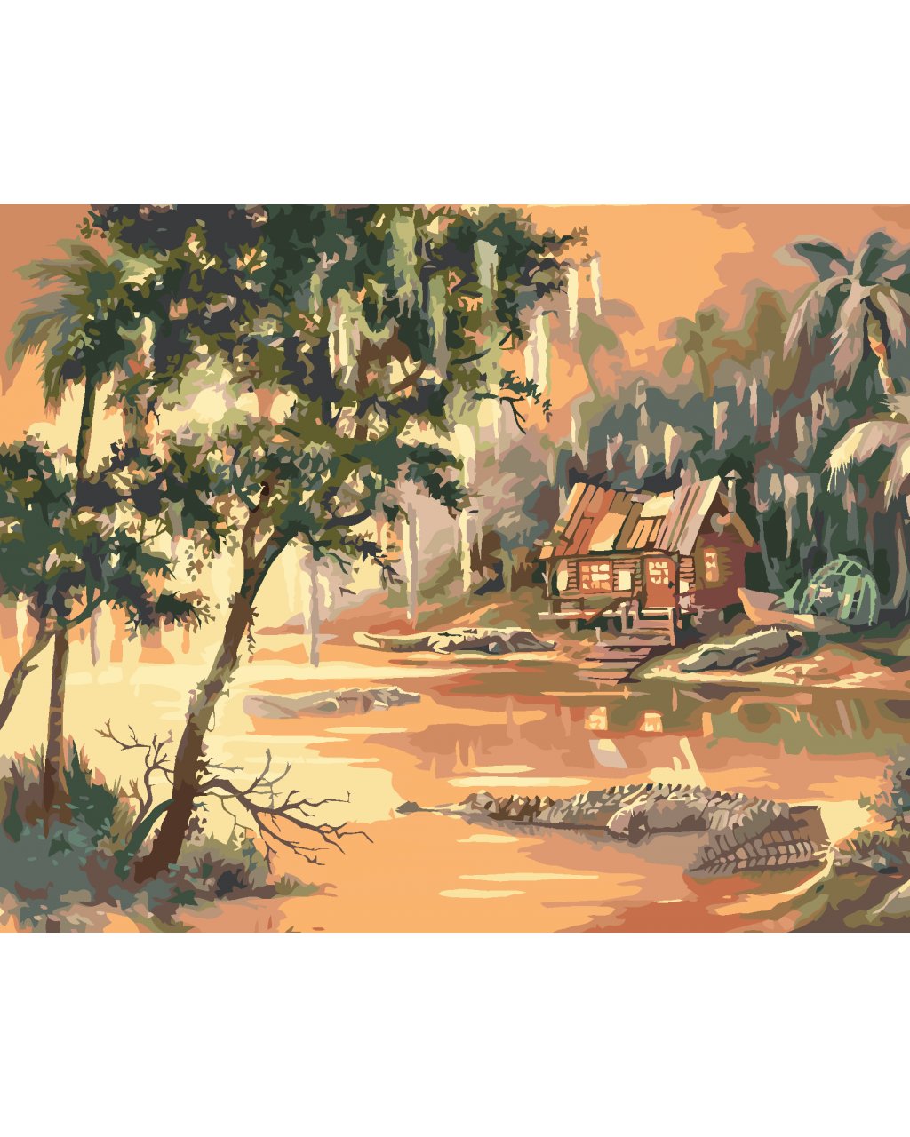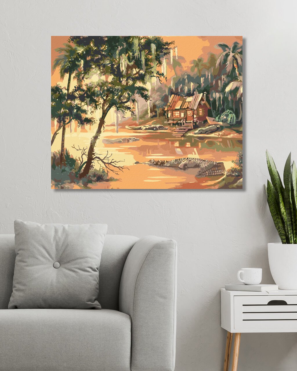 Maľovanie podľa čísel - ALIGÁTORI VO VODE A CHATA V DŽUNGLI (D. RUSTY RUST)