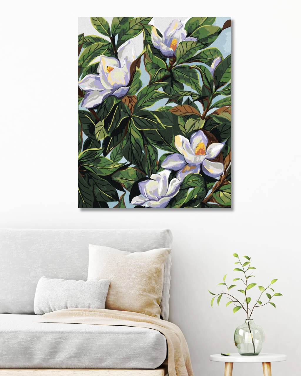 Maľovanie podľa čísel - BIELE KVETY MAGNÓLIE A LISTY (ALEXANDRIA GILBERT)