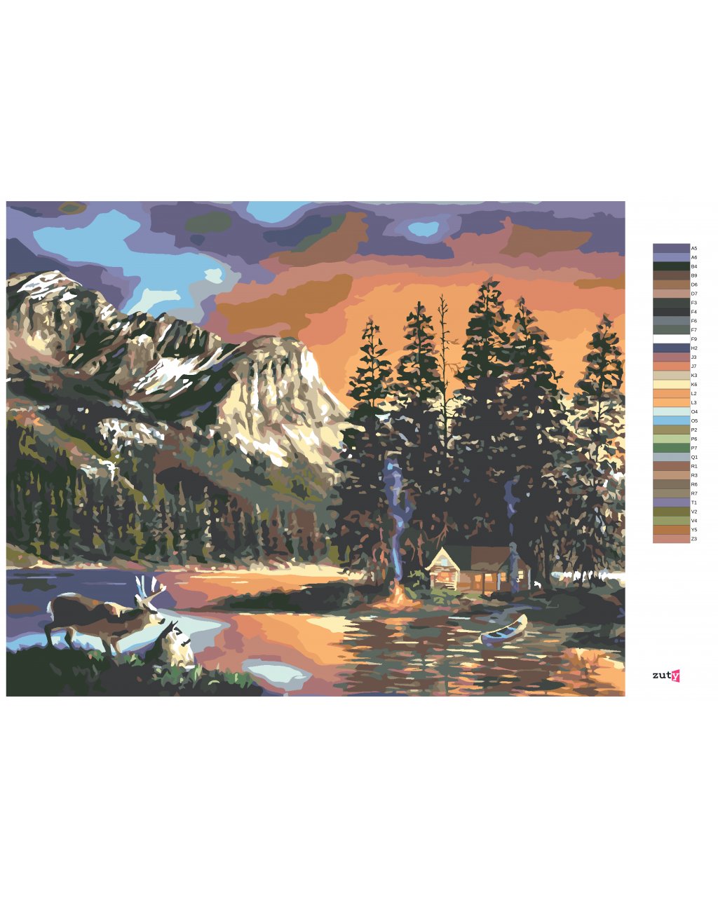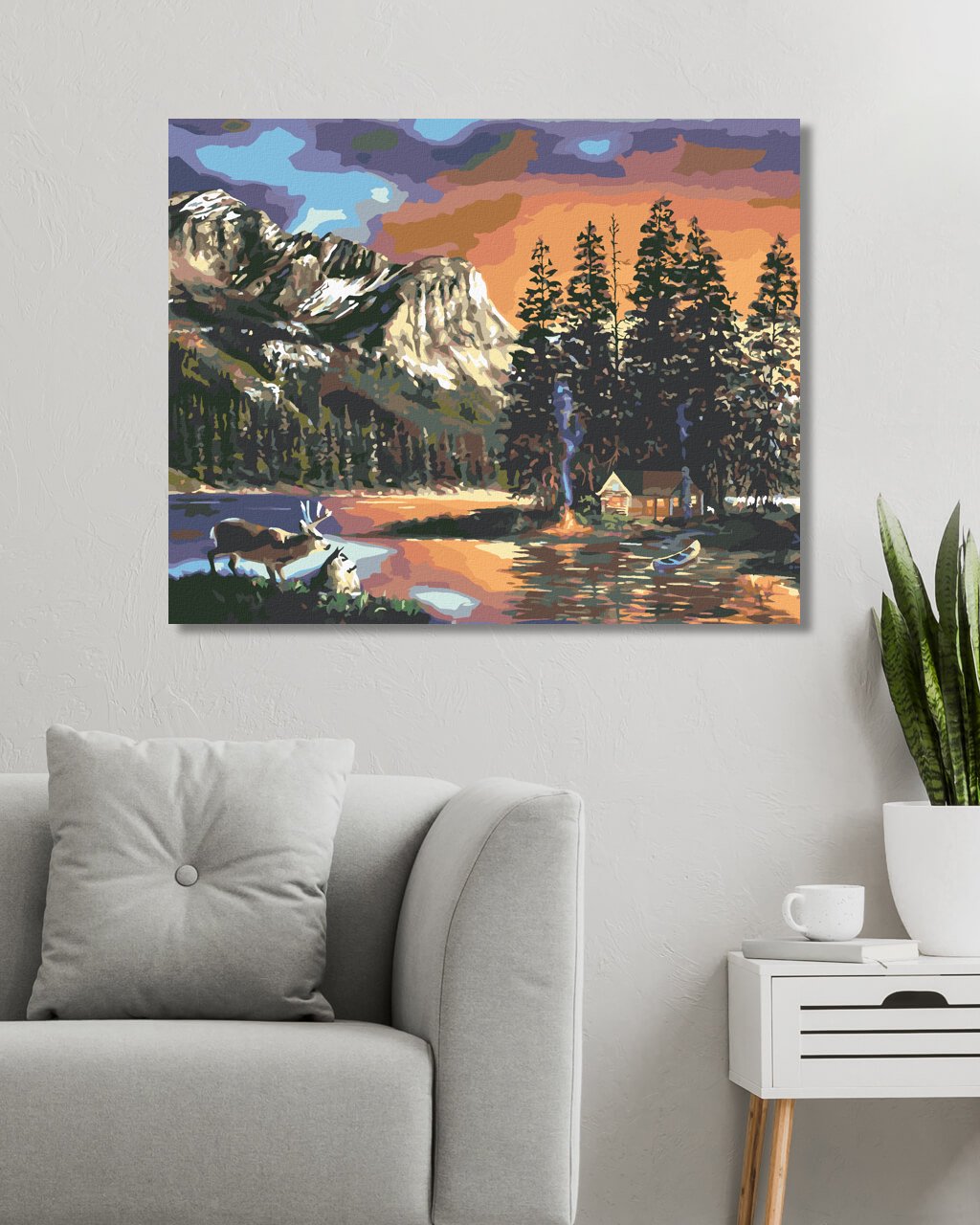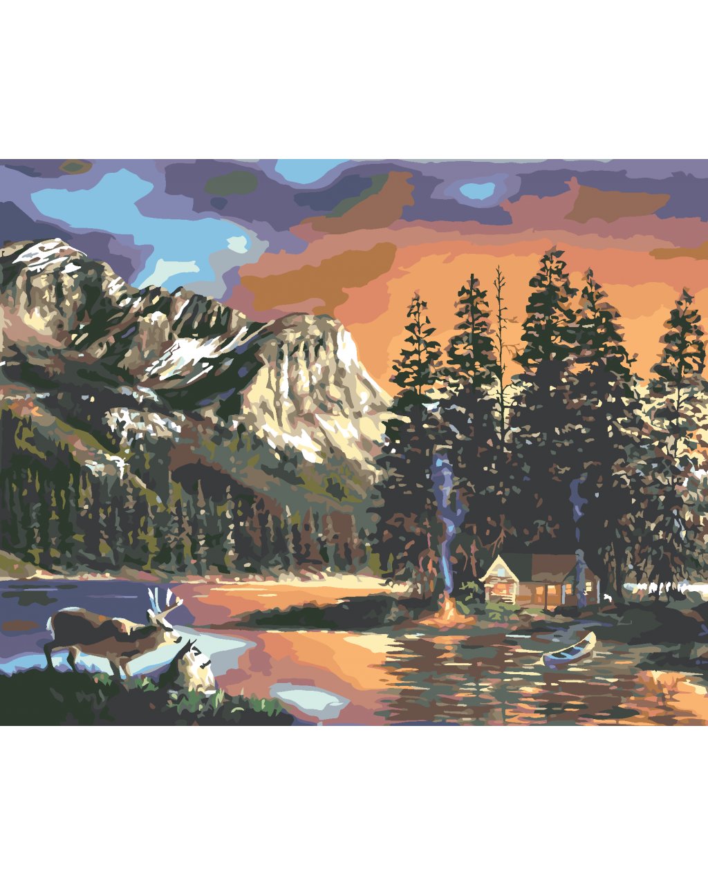 Maľovanie podľa čísel - CHATA, JAZERO, JELEŇ A HORY (D. RUSTY RUST)