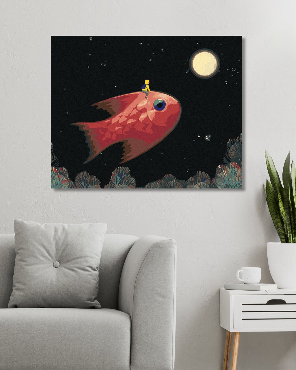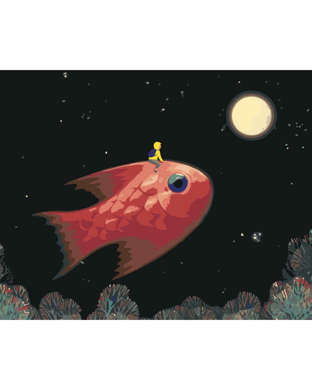 Maľovanie podľa čísel - CHLAPEC S RYBOU NA CESTE NA MESIAC