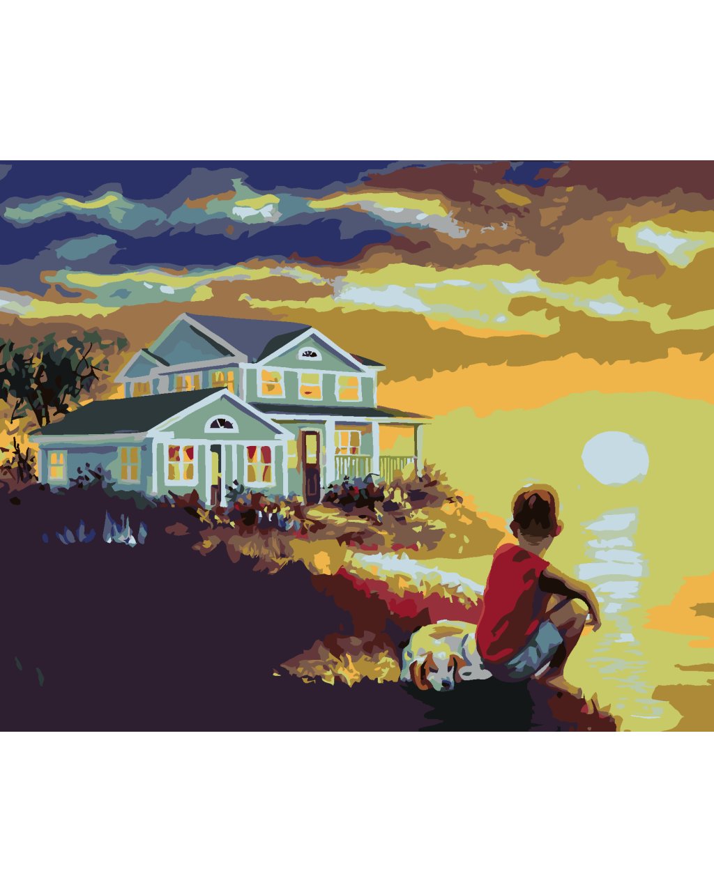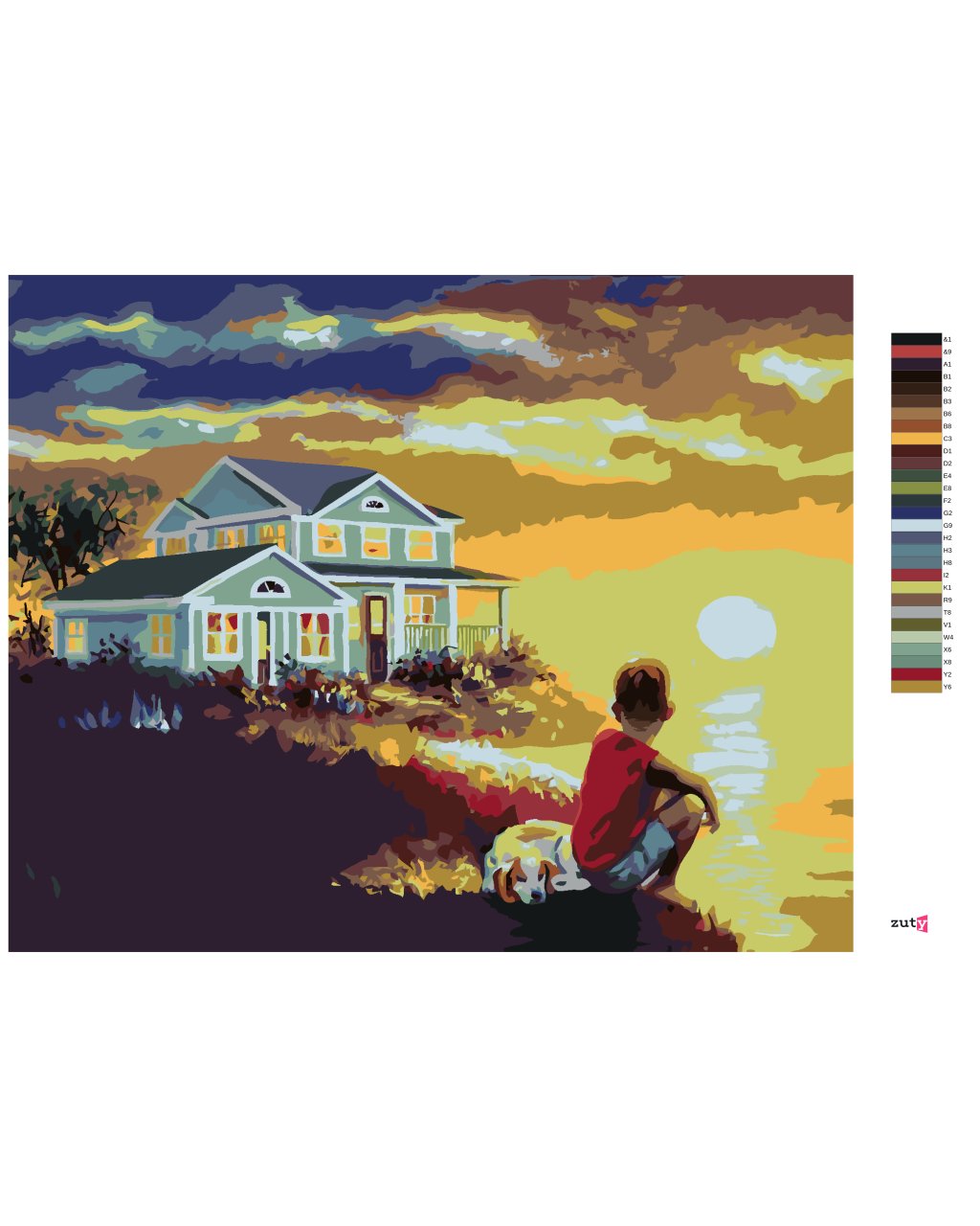Maľovanie podľa čísel - CHLAPEC SO PSOM PRI MORI A ZÁPADE SLNKA (D. RUSTY RUST)