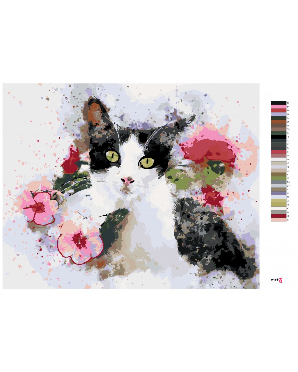 Maľovanie podľa čísel - ČIERNOBIELA MAČKA A RUŽOVÉ KVETY