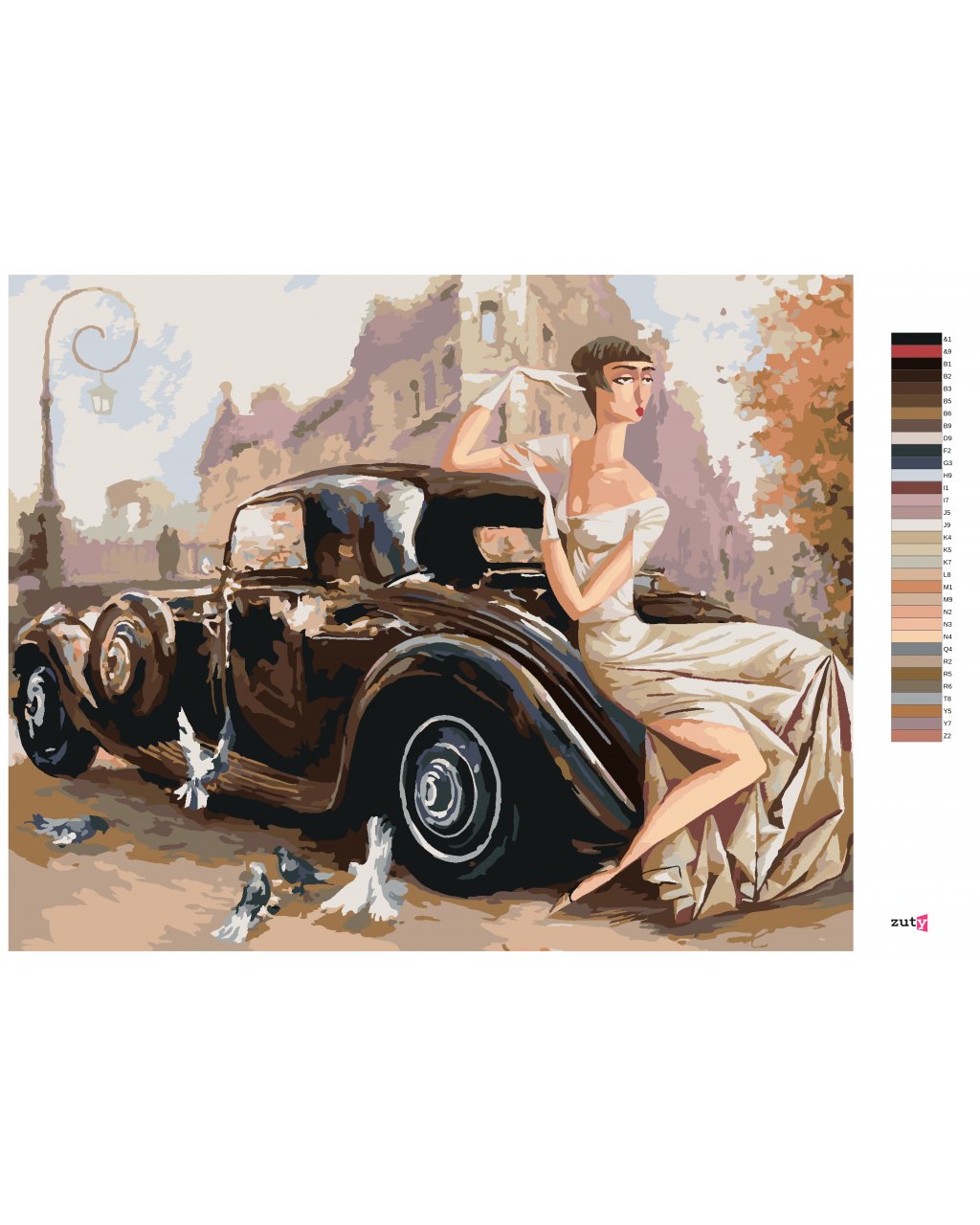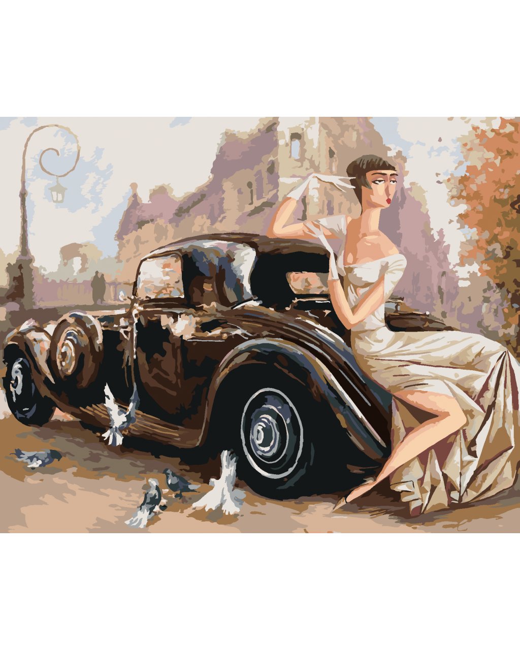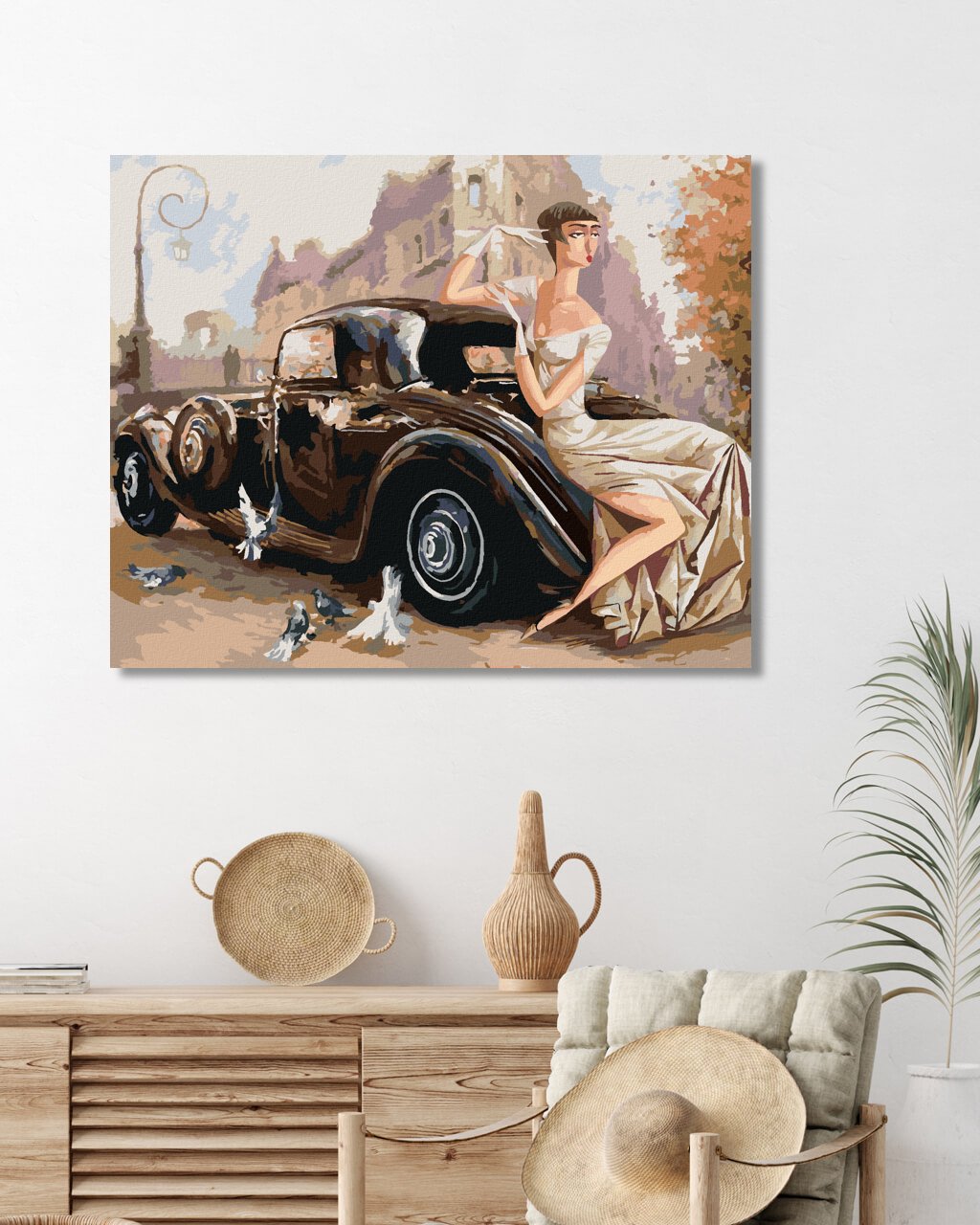 Maľovanie podľa čísel - DÁMA PRI RETRO AUTE