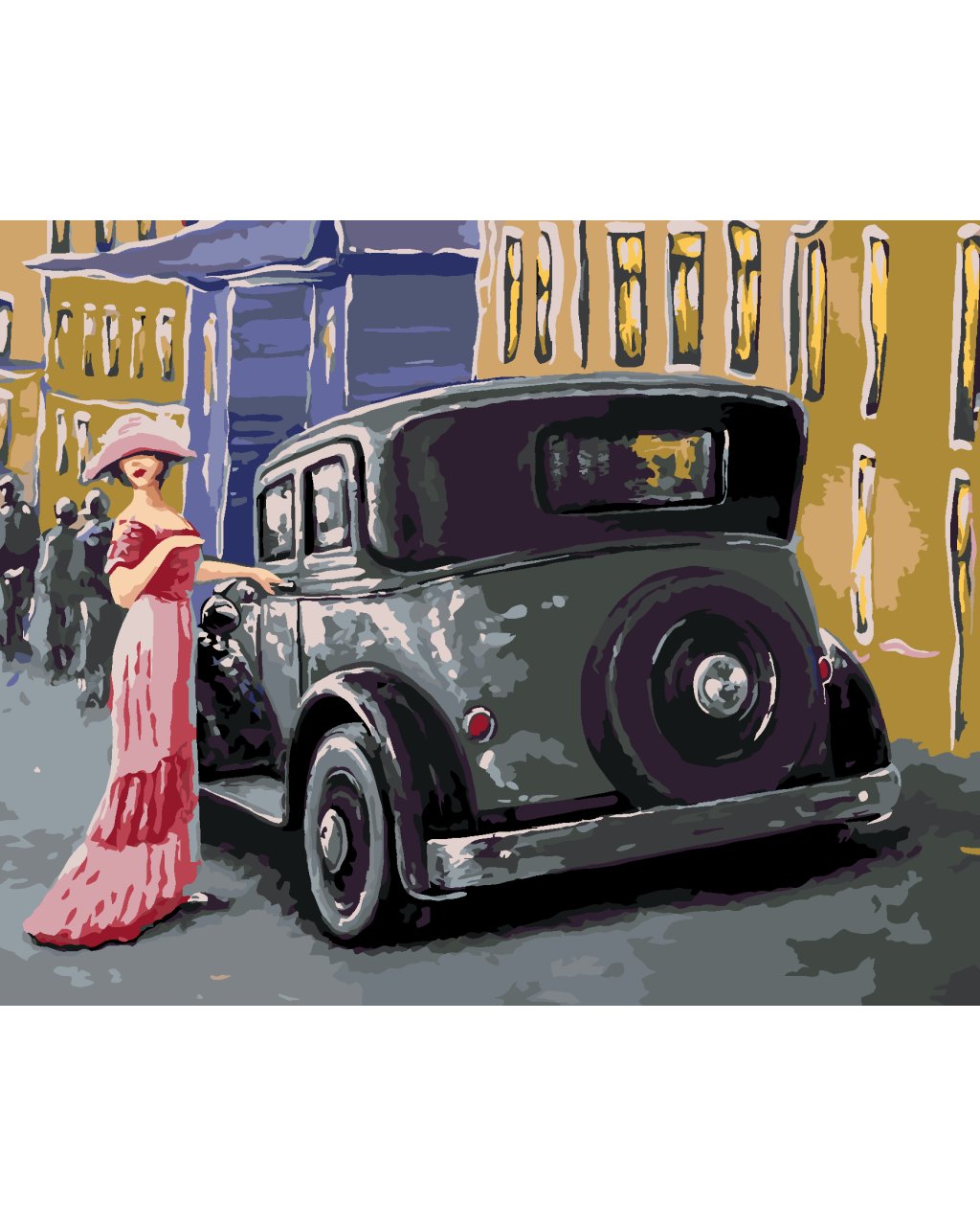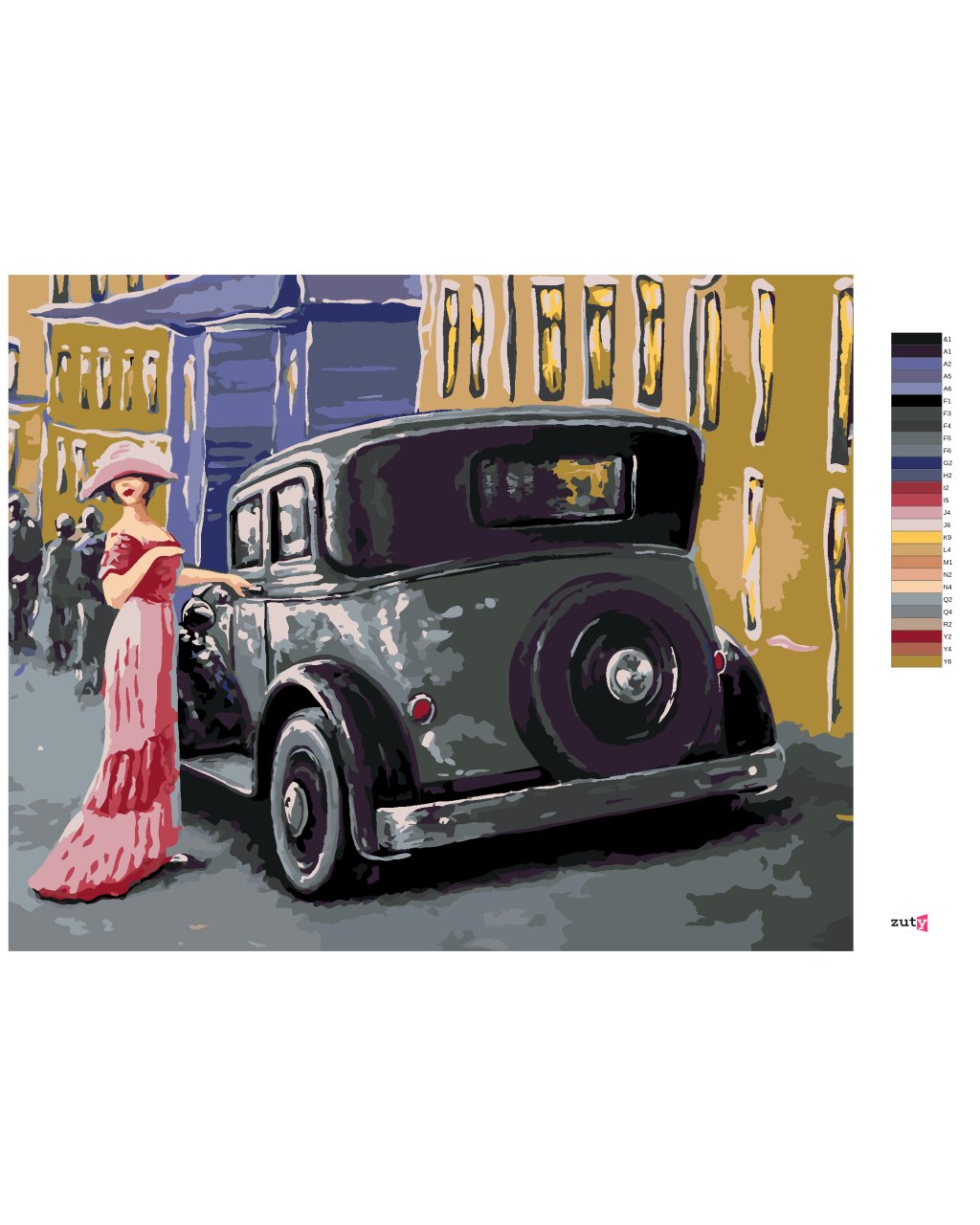 Maľovanie podľa čísel - DÁMA V RUŽOVÝCH ŠATÁCH PRI AUTE
