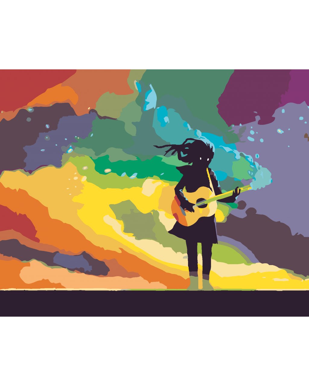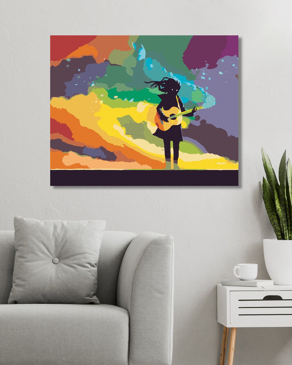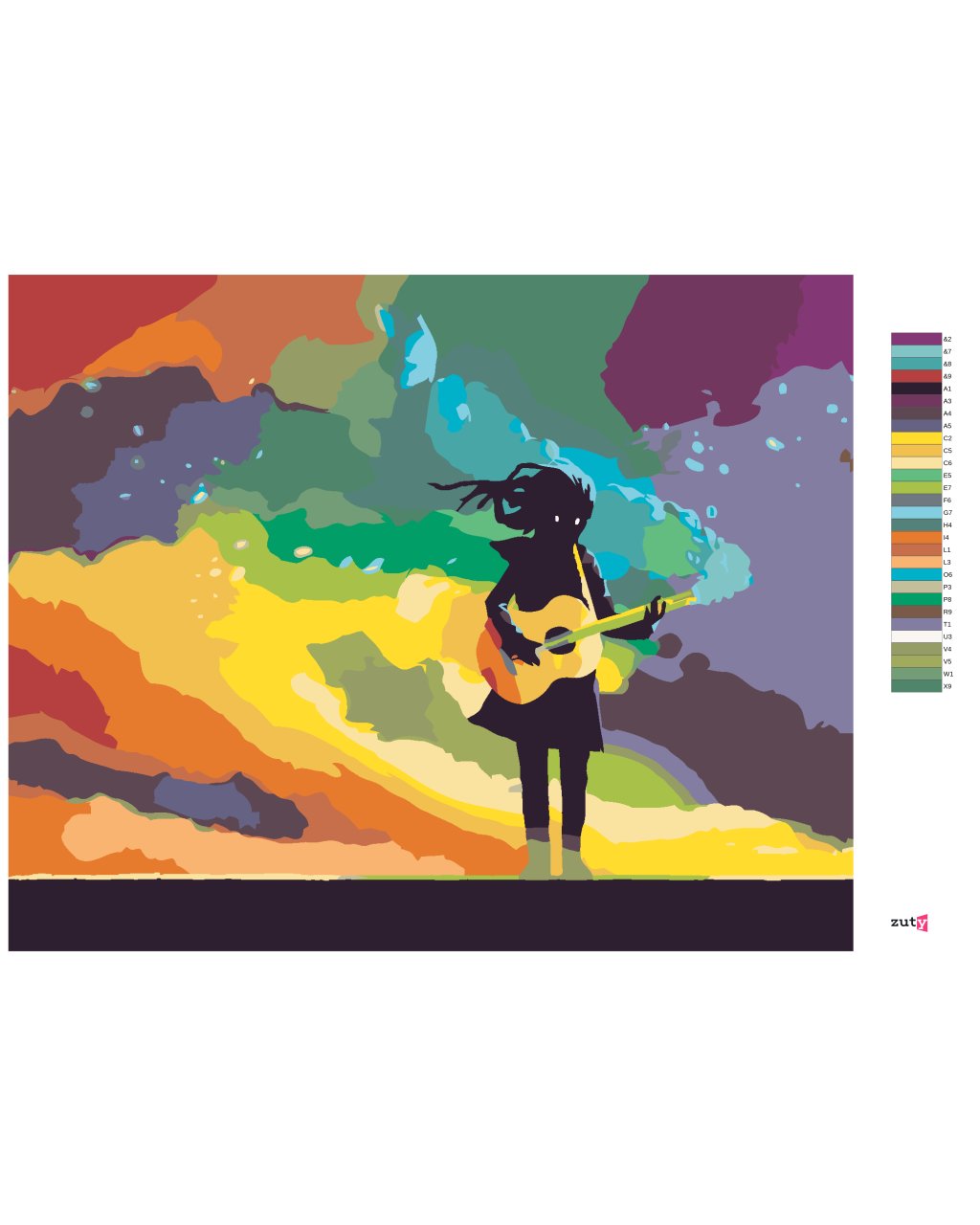 Maľovanie podľa čísel - DIEVČA HRAJÚCE NA GITARU S FAREBNÝM DYMOM