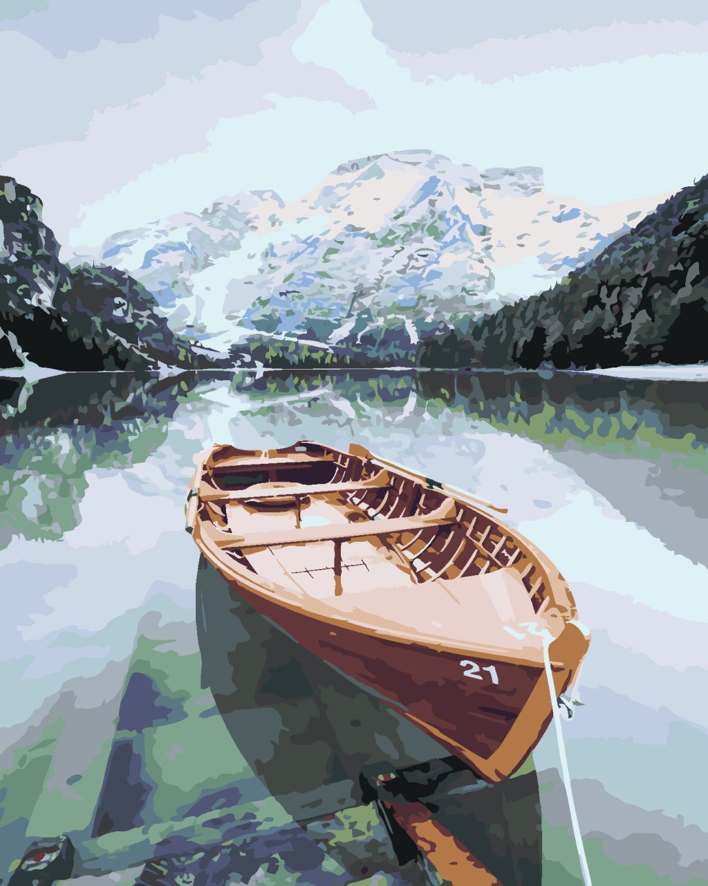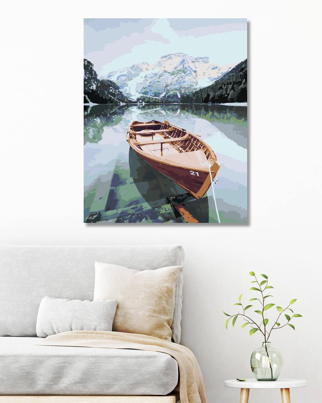 Maľovanie podľa čísel - DREVENÁ LOĎKA NA ALPSKOM JAZERE