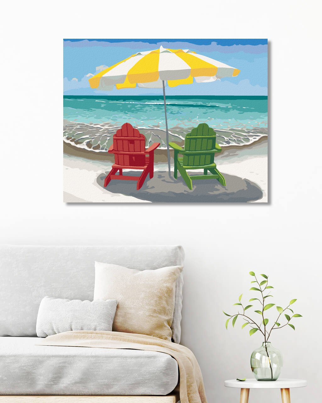 Maľovanie podľa čísel - DREVENÉ STOLIČKY S DÁŽDNIKOM NA PLÁŽI (Robert Johnson)