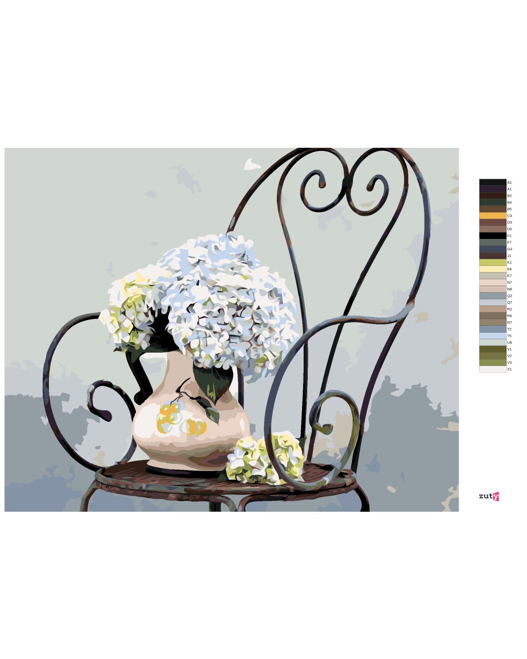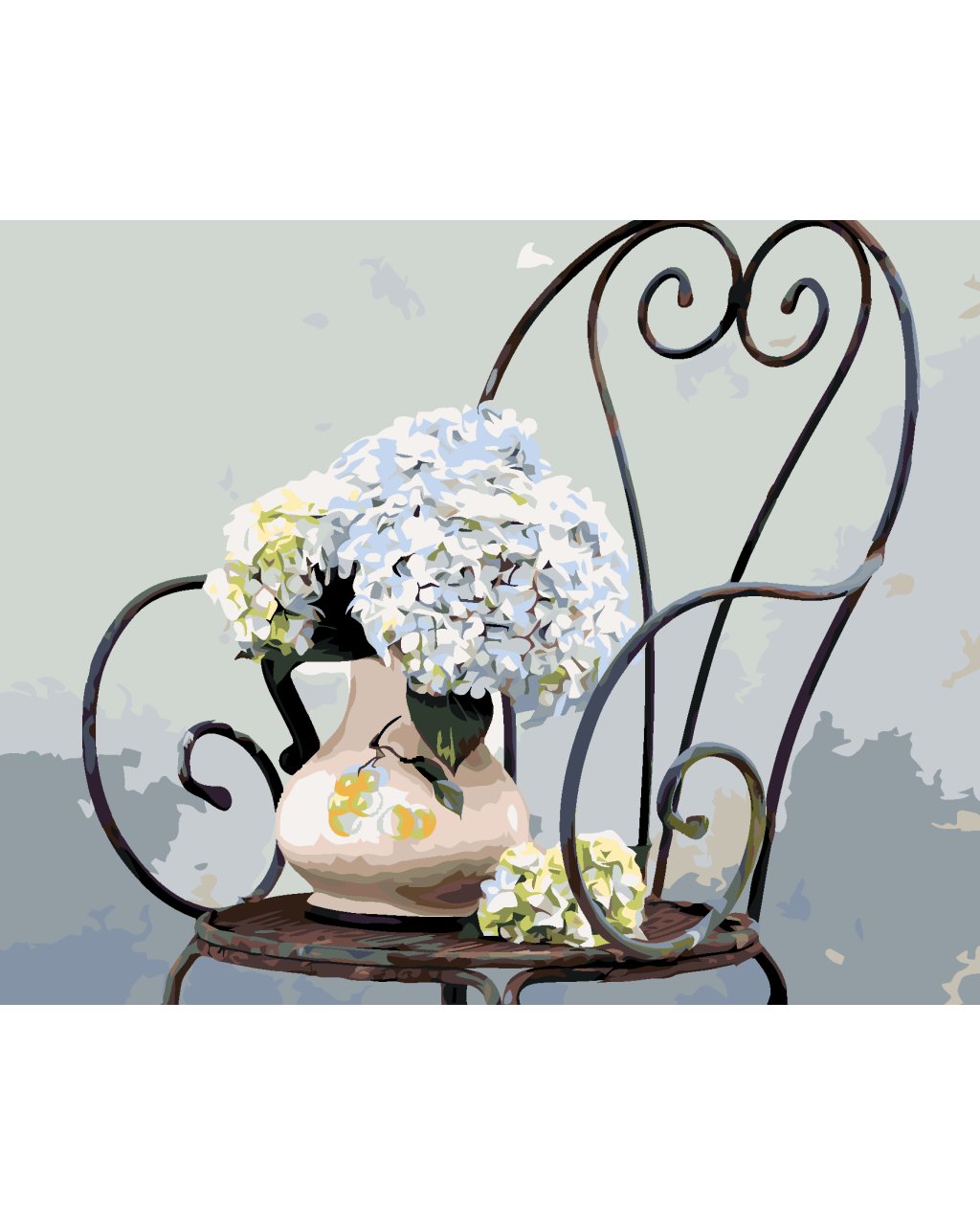 Maľovanie podľa čísel - HORTENZIE VO VÁZE NA STOLIČKE