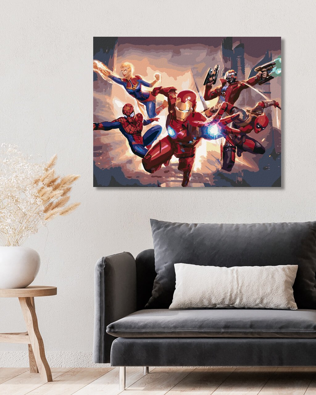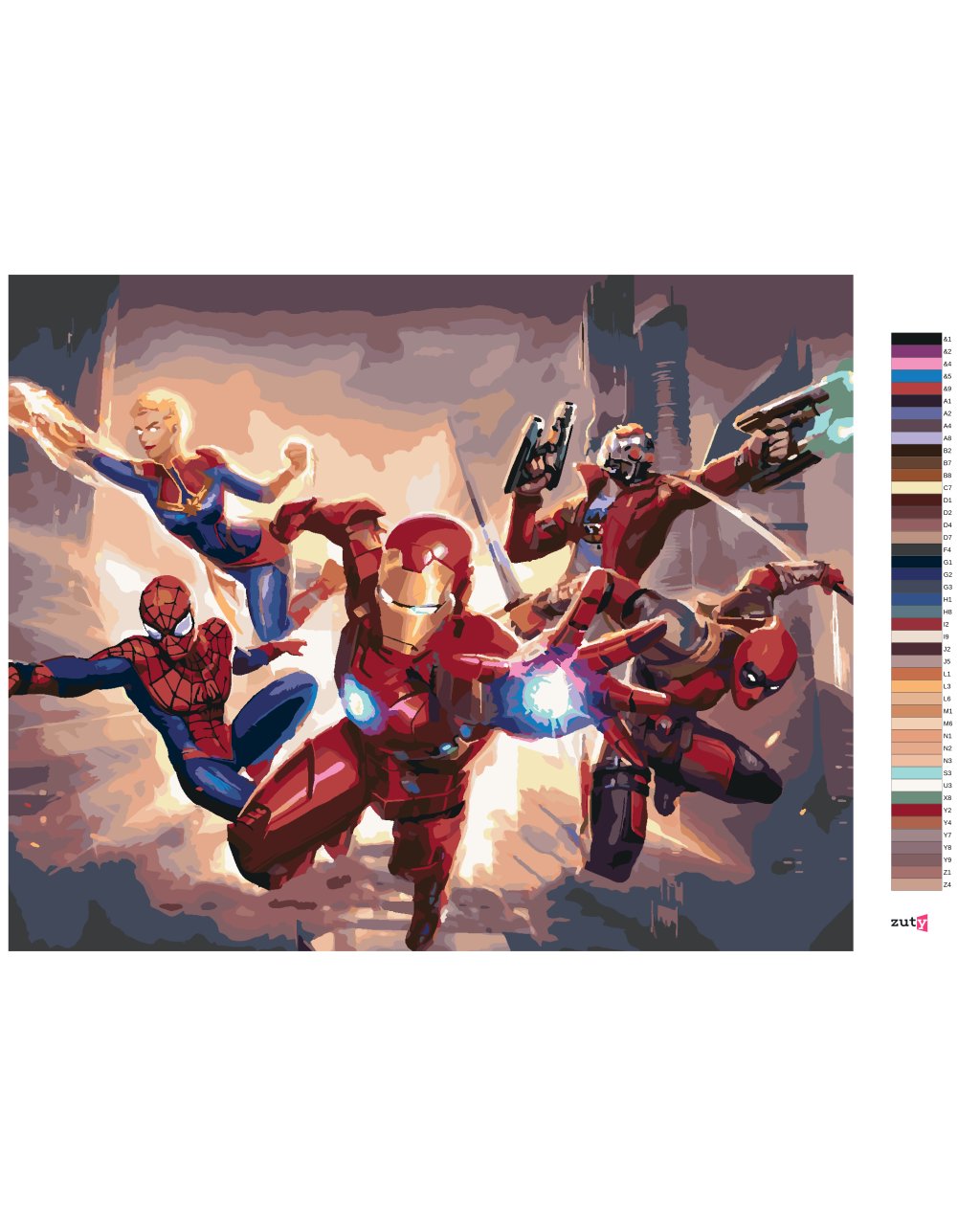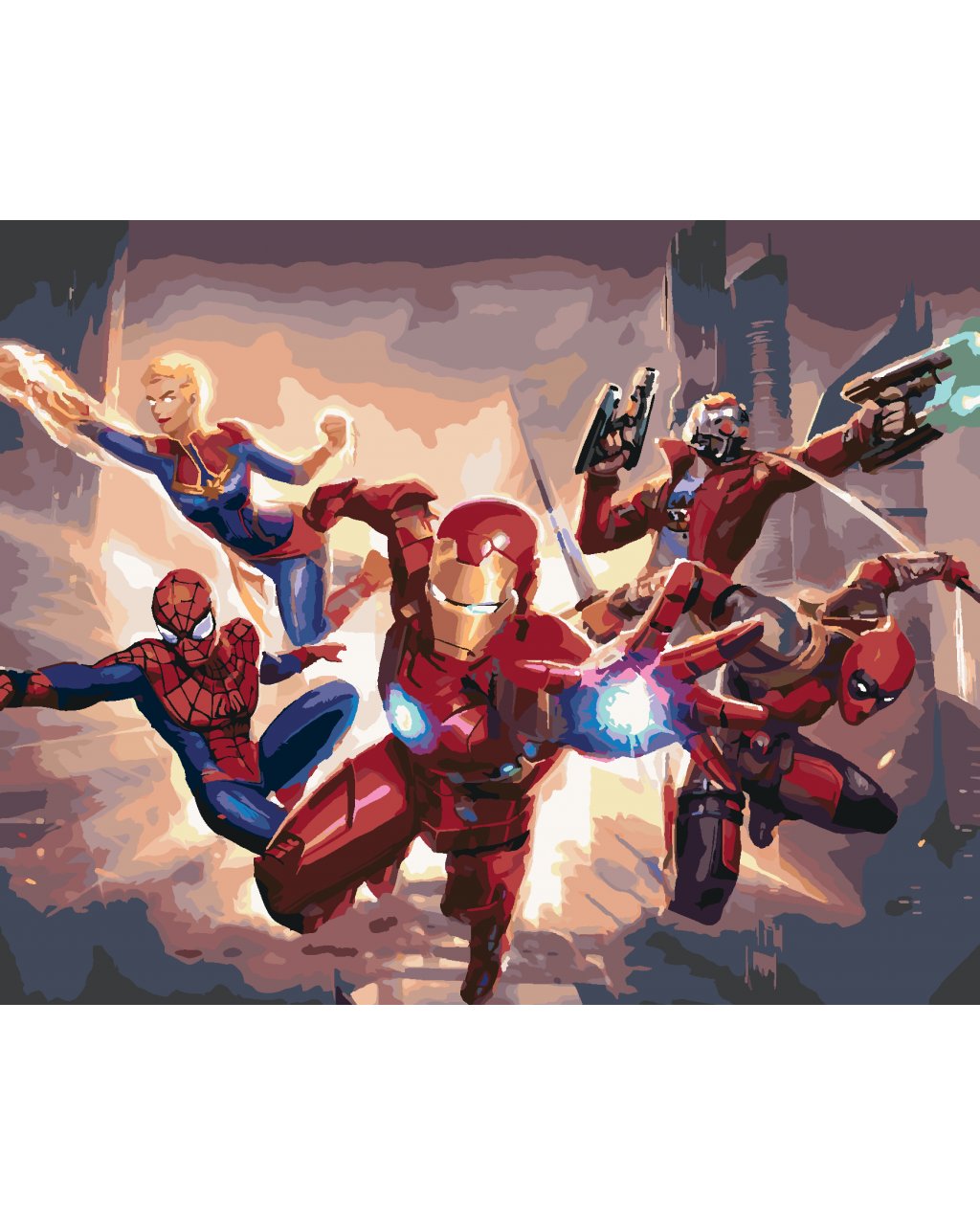 Maľovanie podľa čísel - IRON MAN, SPIDERMAN, CAPTAIN MARVEL, DEADPOOL A STAR-LORD MIERIA DO BOJA