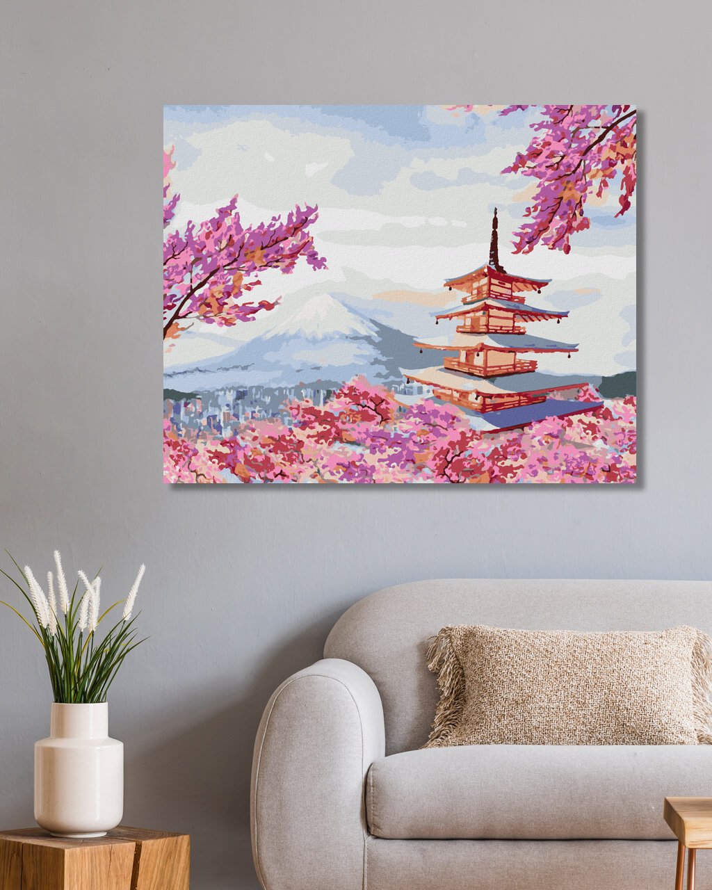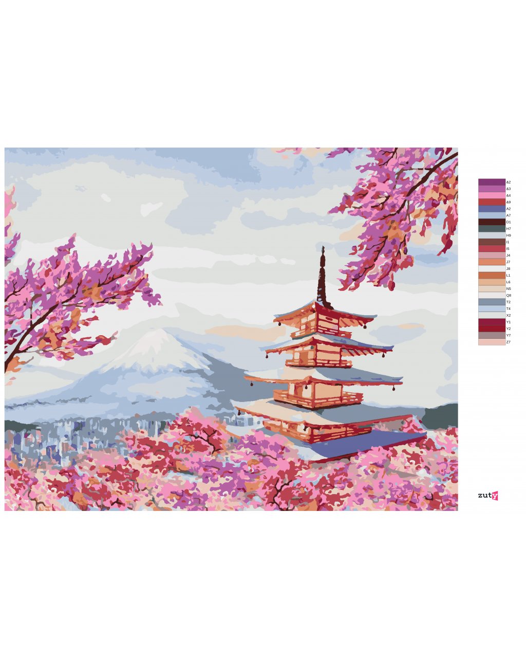 Maľovanie podľa čísel - JAPONSKO CHRÁM A RUŽOVÉ KVETY