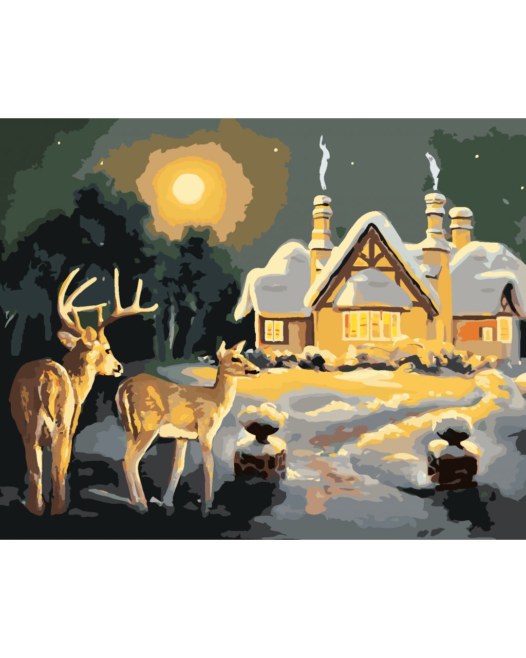 Maľovanie podľa čísel - JELEŇ A LAŇ PRI ZASNEŽENOM DOME (D. RUSTY RUST)