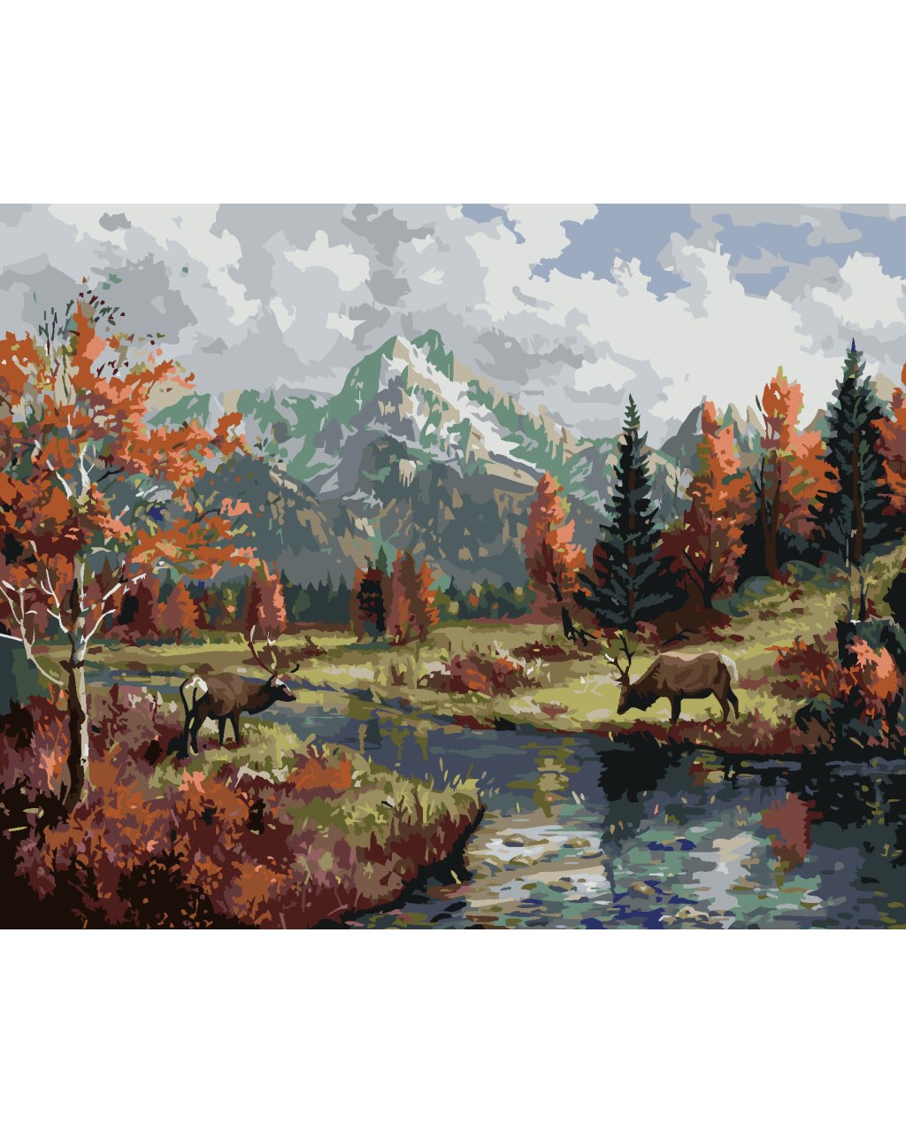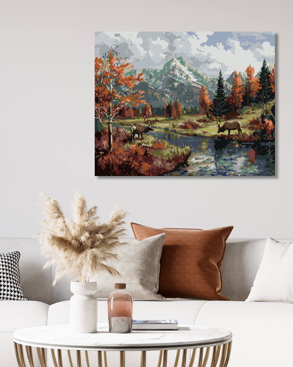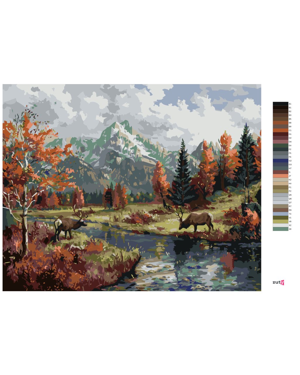 Maľovanie podľa čísel - JELEŇ PRI RIEKE, HORY A JESENNÉ STROMY