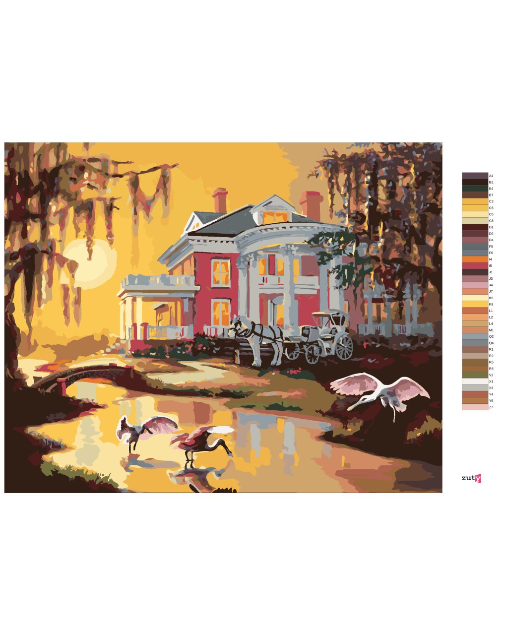 Maľovanie podľa čísel - KOČIAR S BIELYM KOŇOM PRI DOME, VTÁKY A ZÁPAD SLNKA (D. RUSTY RUST)