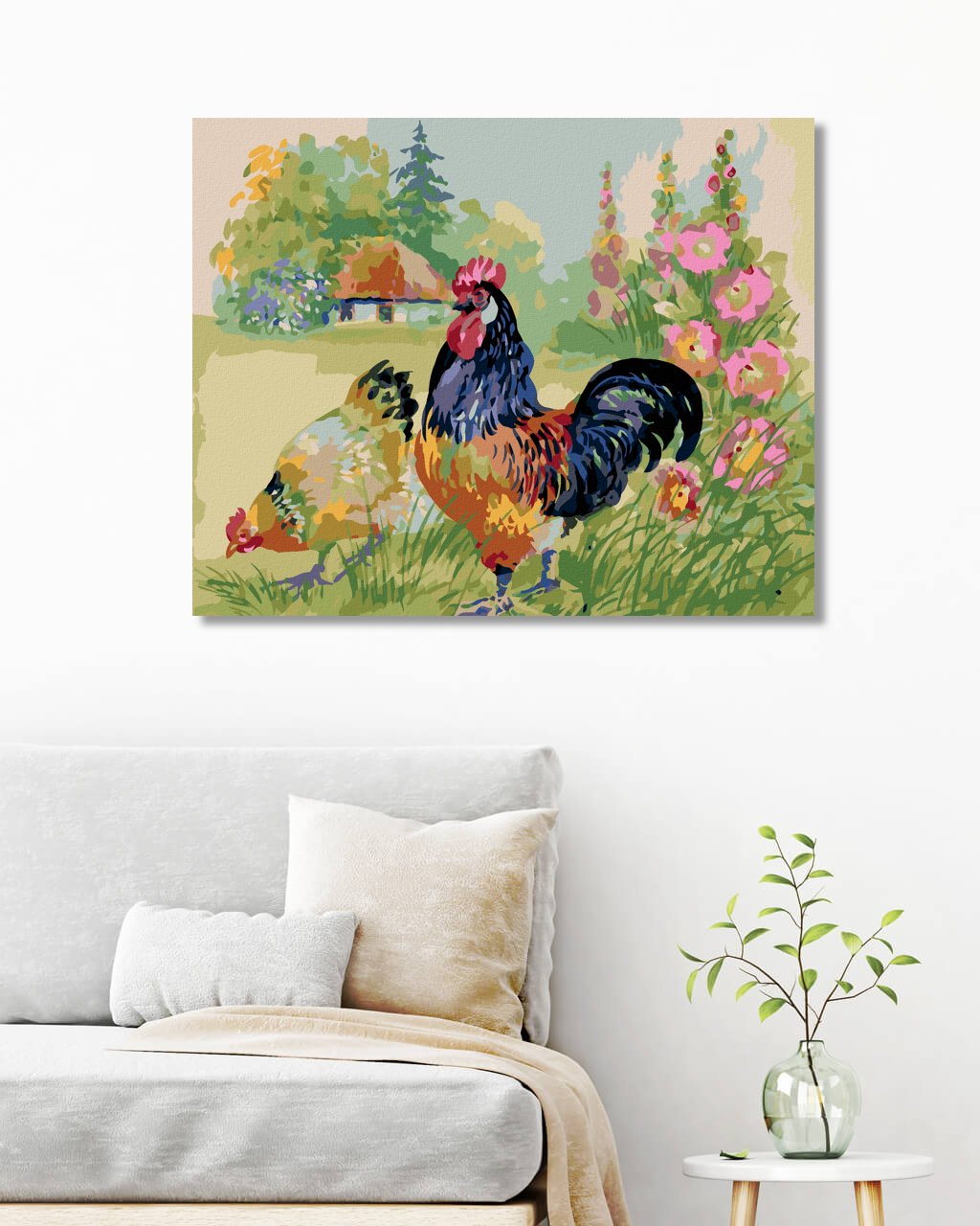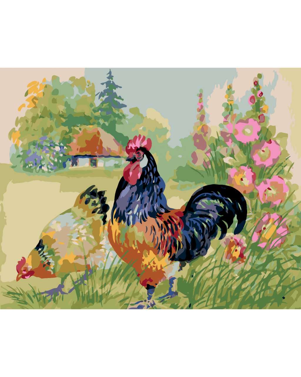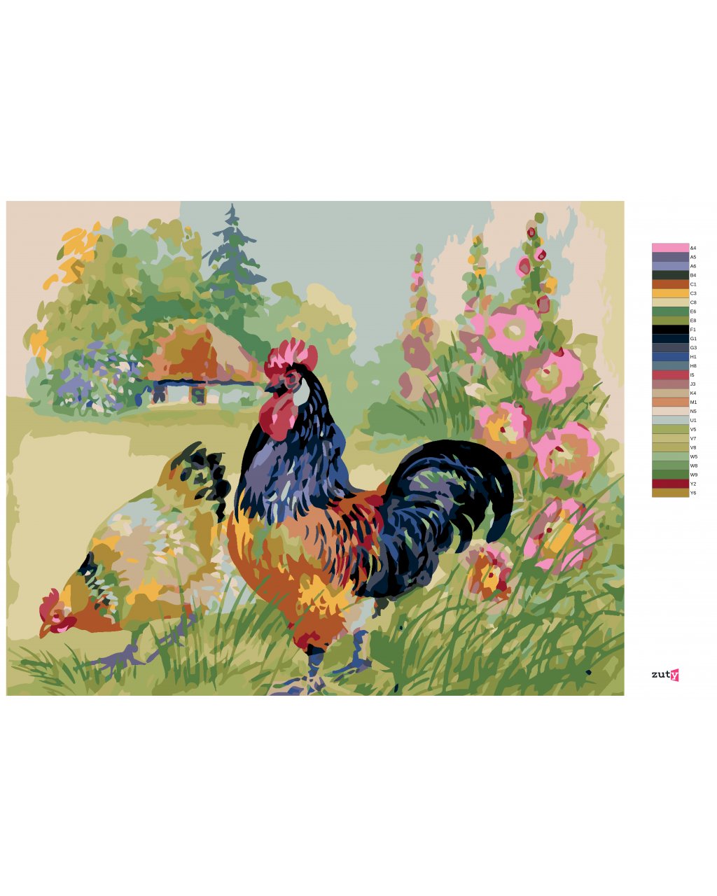Maľovanie podľa čísel - KOHÚT SO SLIEPKAMI OBKLOPENÍ KVETMI