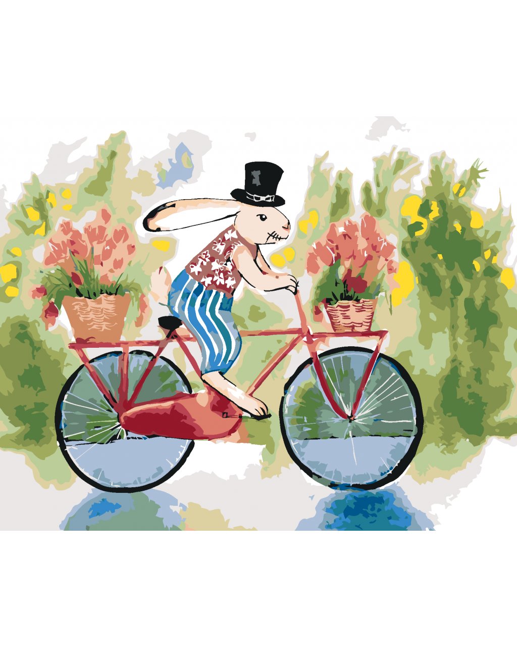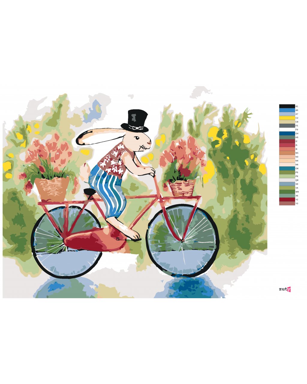 Maľovanie podľa čísel - KRÁLIK V KLOBÚKU NA BICYKLI