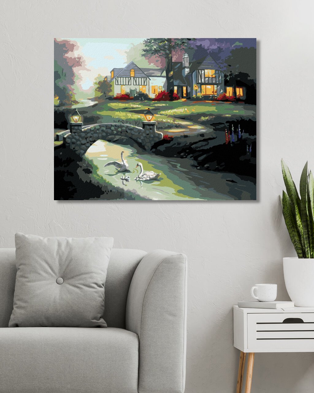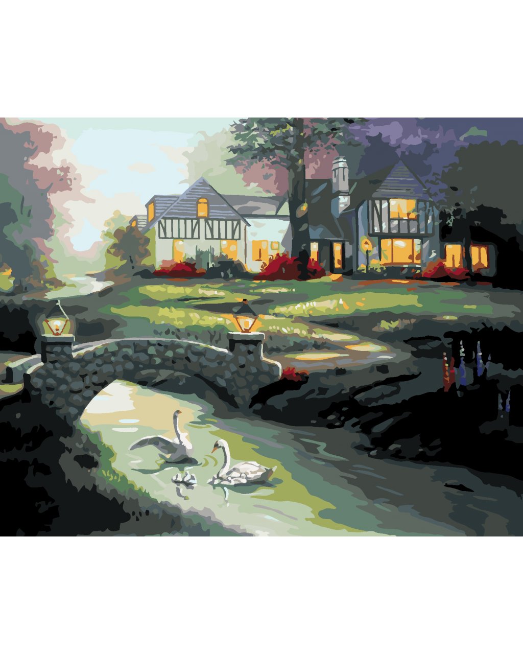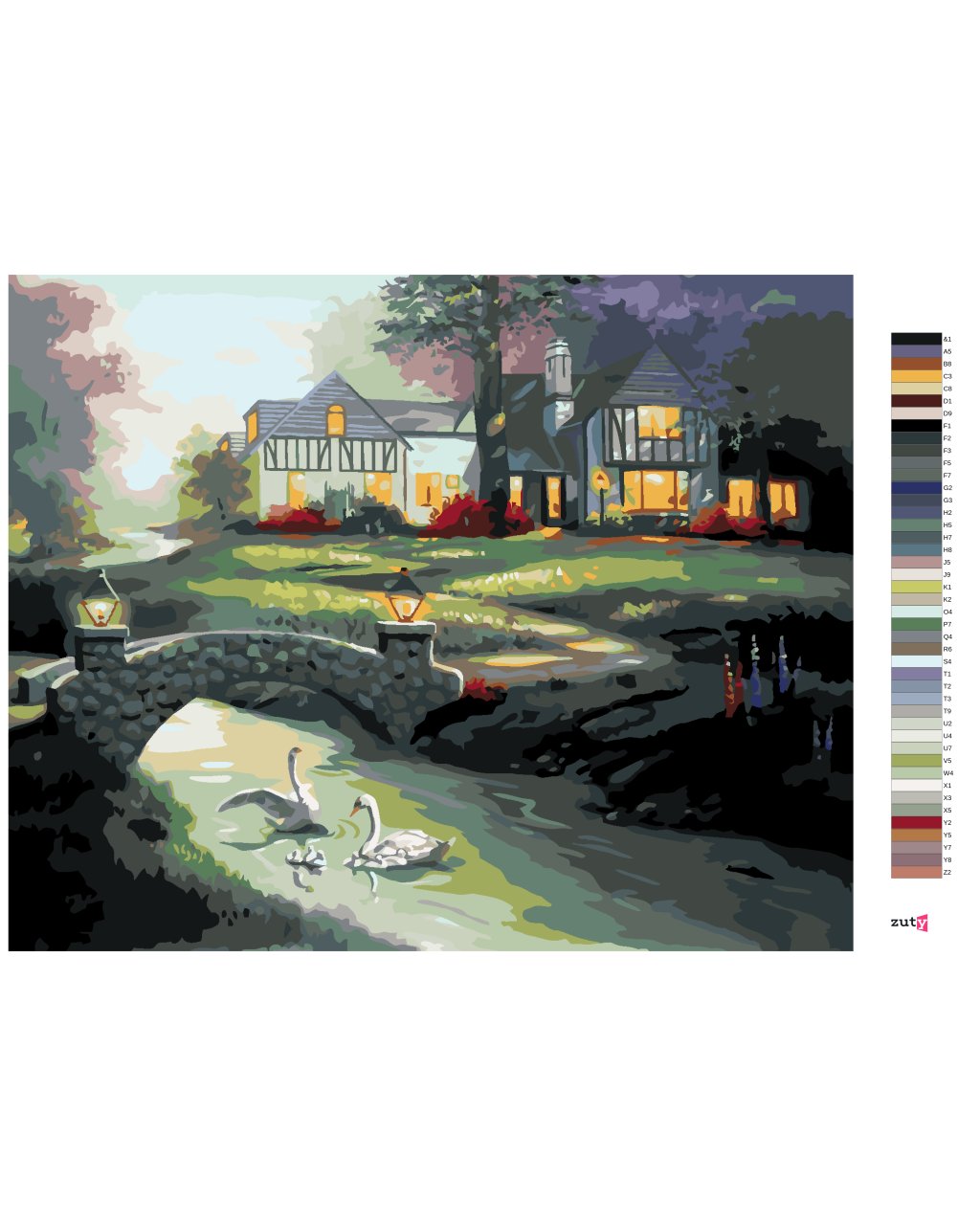 Maľovanie podľa čísel - LABUTE NA RIEKE A DOM (D. RUSTY RUST)