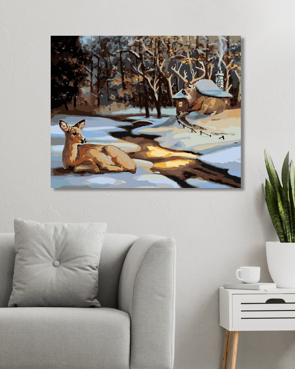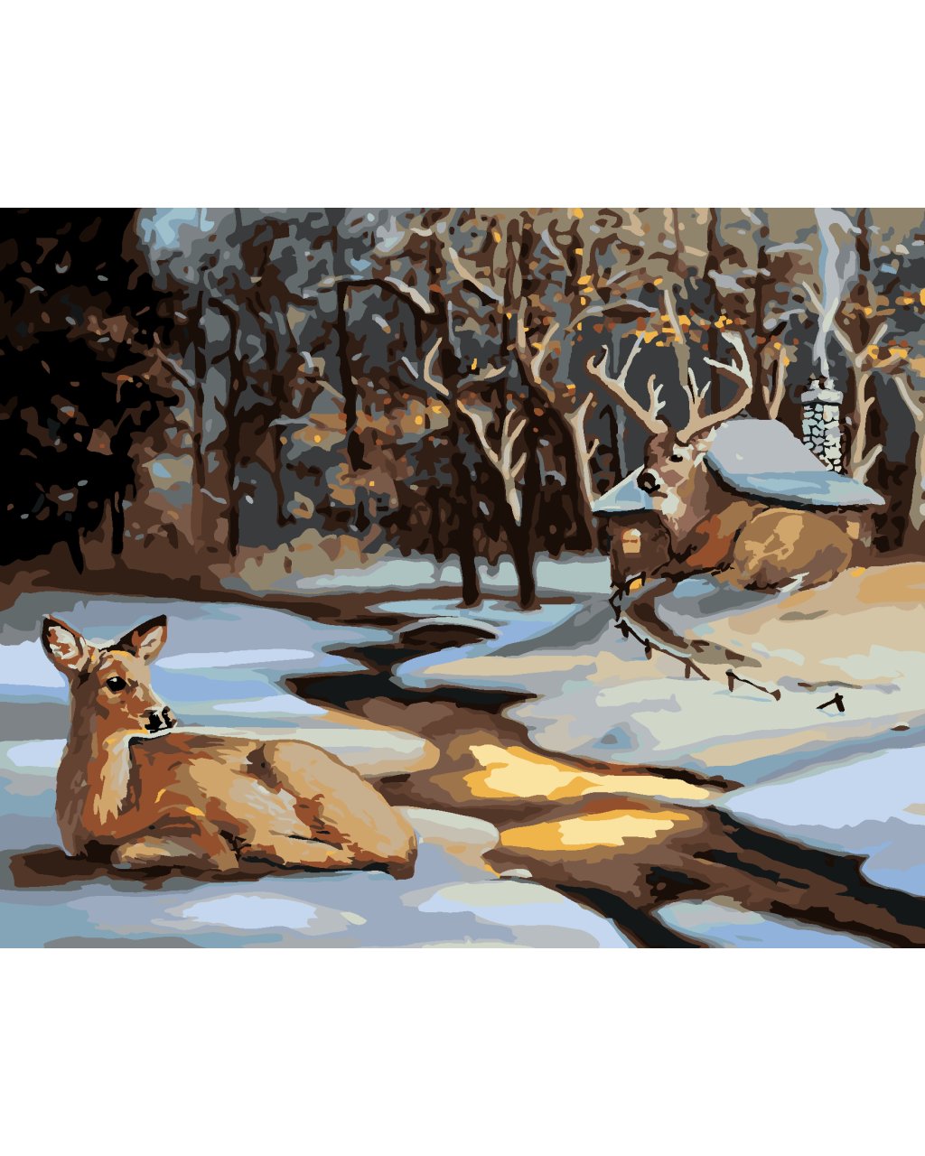 Maľovanie podľa čísel - LAŇ A JELEŇ PRI ZASNEŽENOM DOME (D. RUSTY RUST)