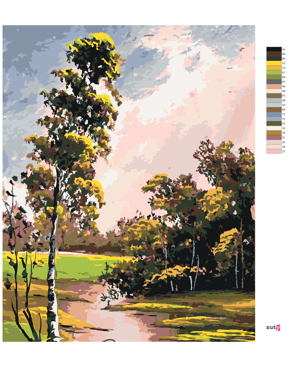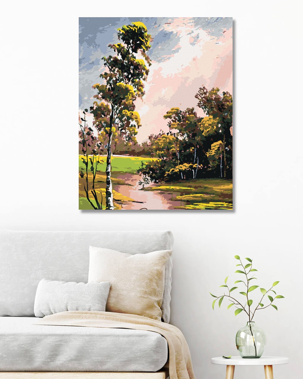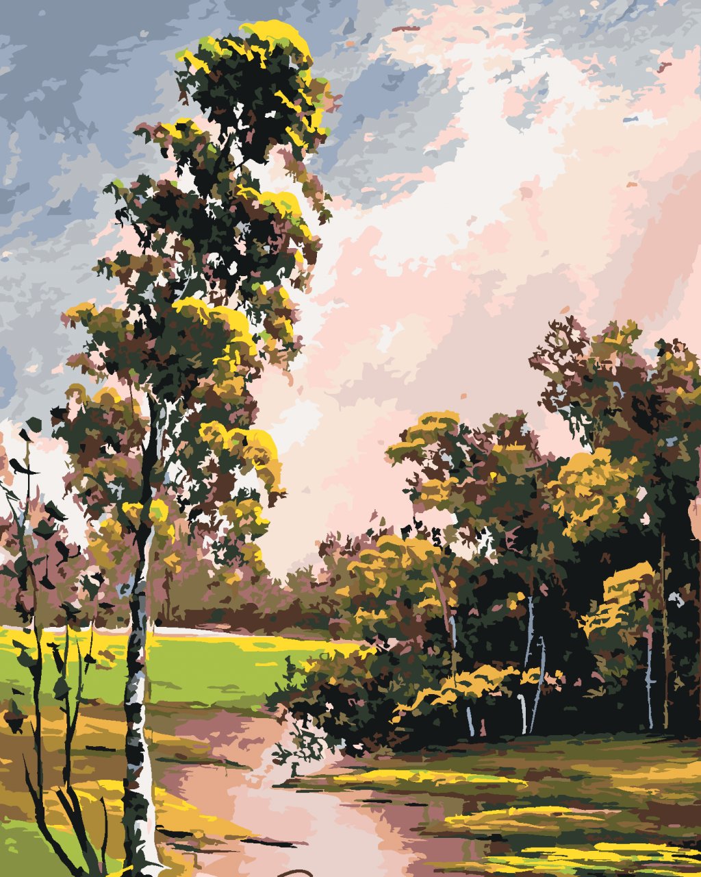 Maľovanie podľa čísel - LETNÁ KRAJINA S BREZOU A JAZIERKOM