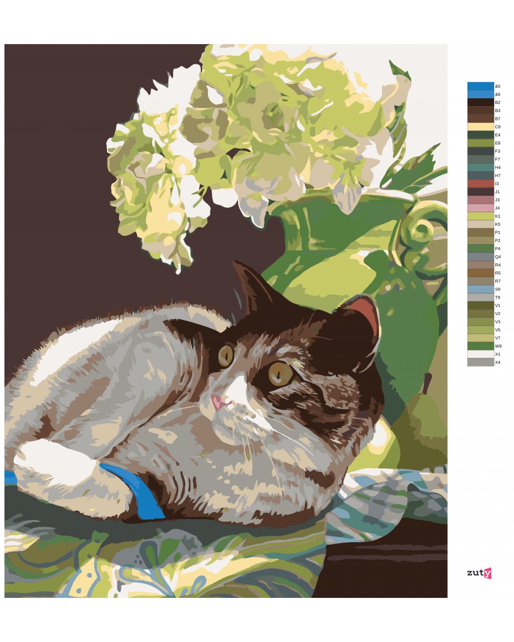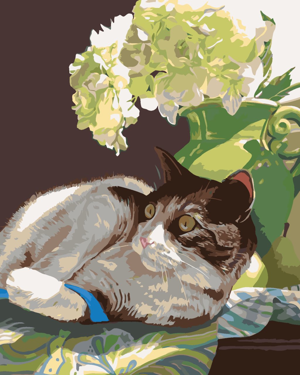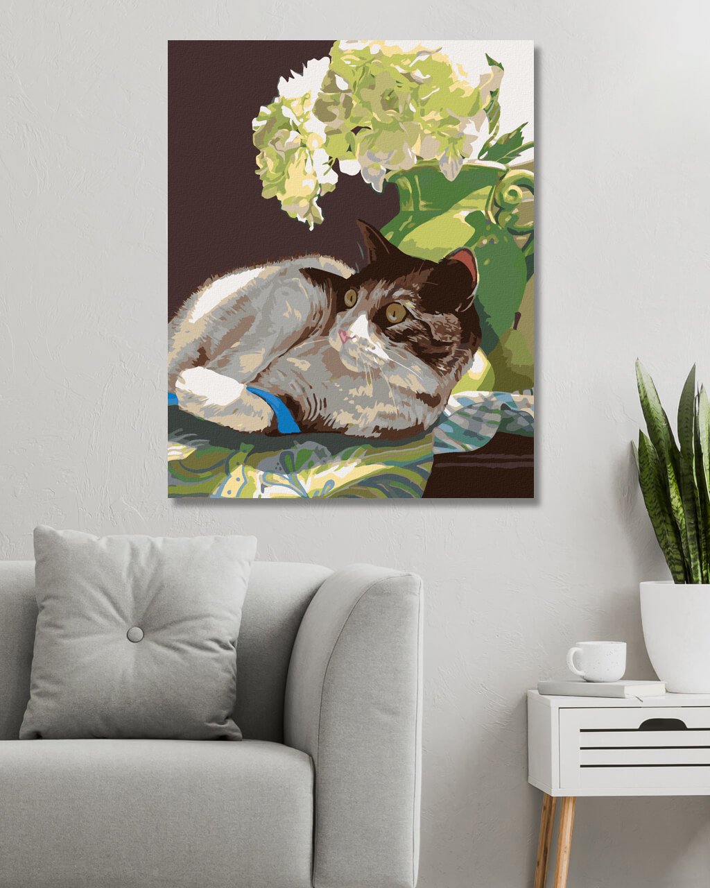 Maľovanie podľa čísel - LEŽIACI KOCÚR POD KVETOM (MARDELL SCHUSTER)