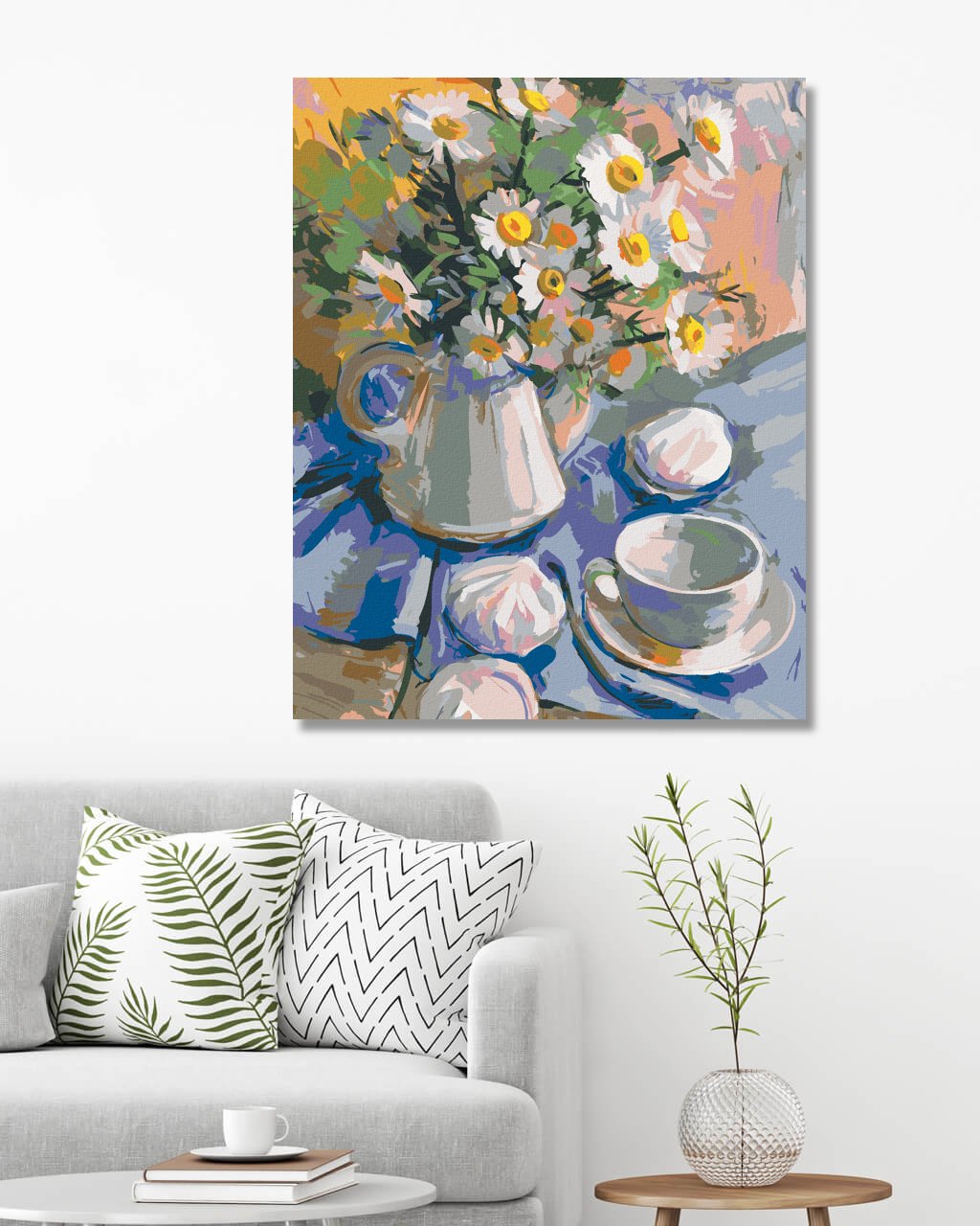 Maľovanie podľa čísel - MARGARÉTY VO VÁZE NA MODROM OBRUSE