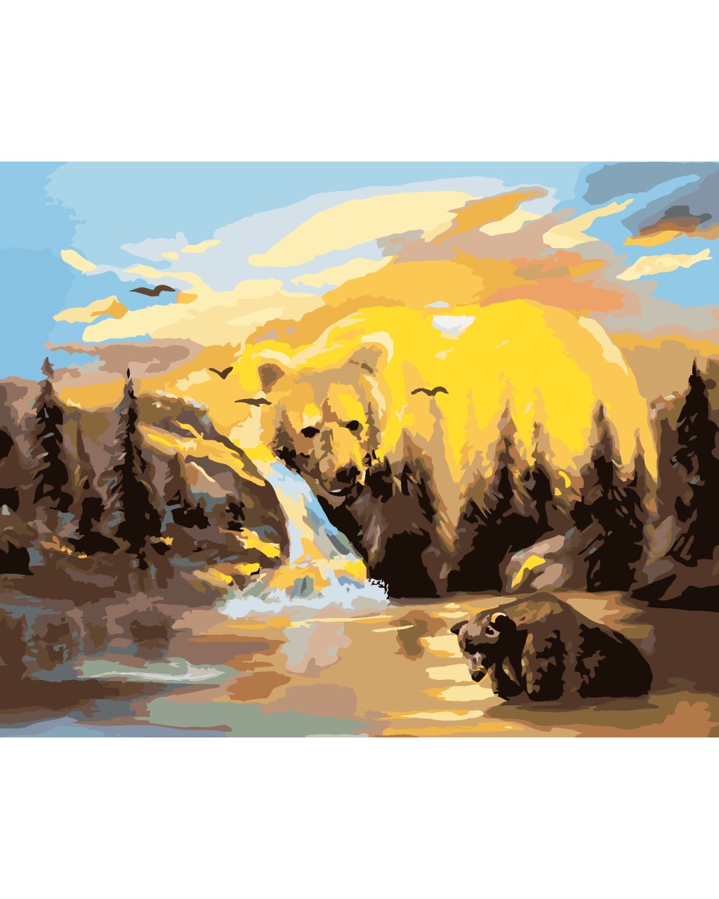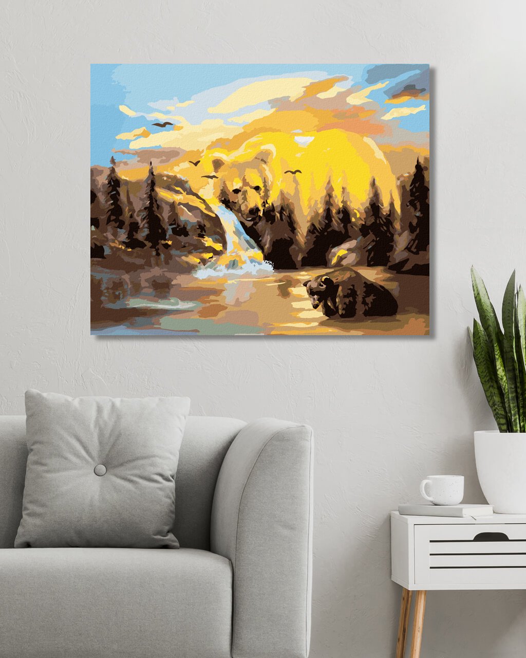 Maľovanie podľa čísel - MEDVEĎ, VODOPÁD A ZÁPAD SLNKA (D. RUSTY RUST)