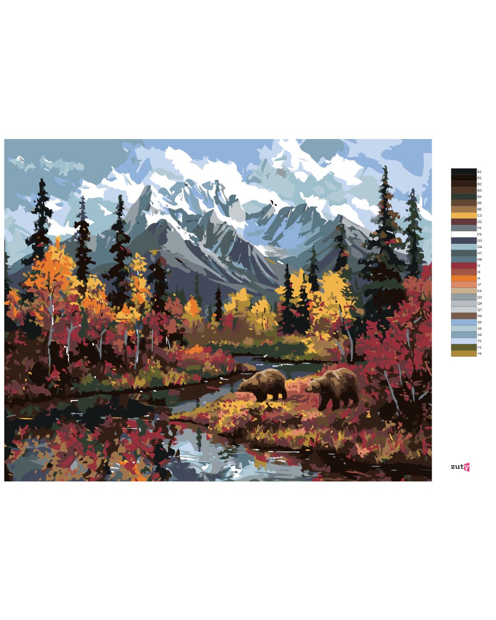 Maľovanie podľa čísel - MEDVEĎ PRI RIKE, HORY A JESENNÉ STROMY